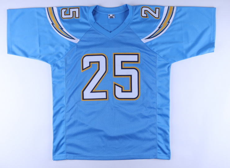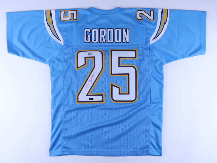 Custom on-field style jersey. Everything sewn on, size XL. Hand-signed by Melvin Gordon. Please note, minor staining on reverse side number.