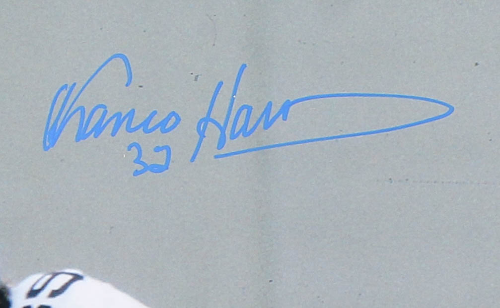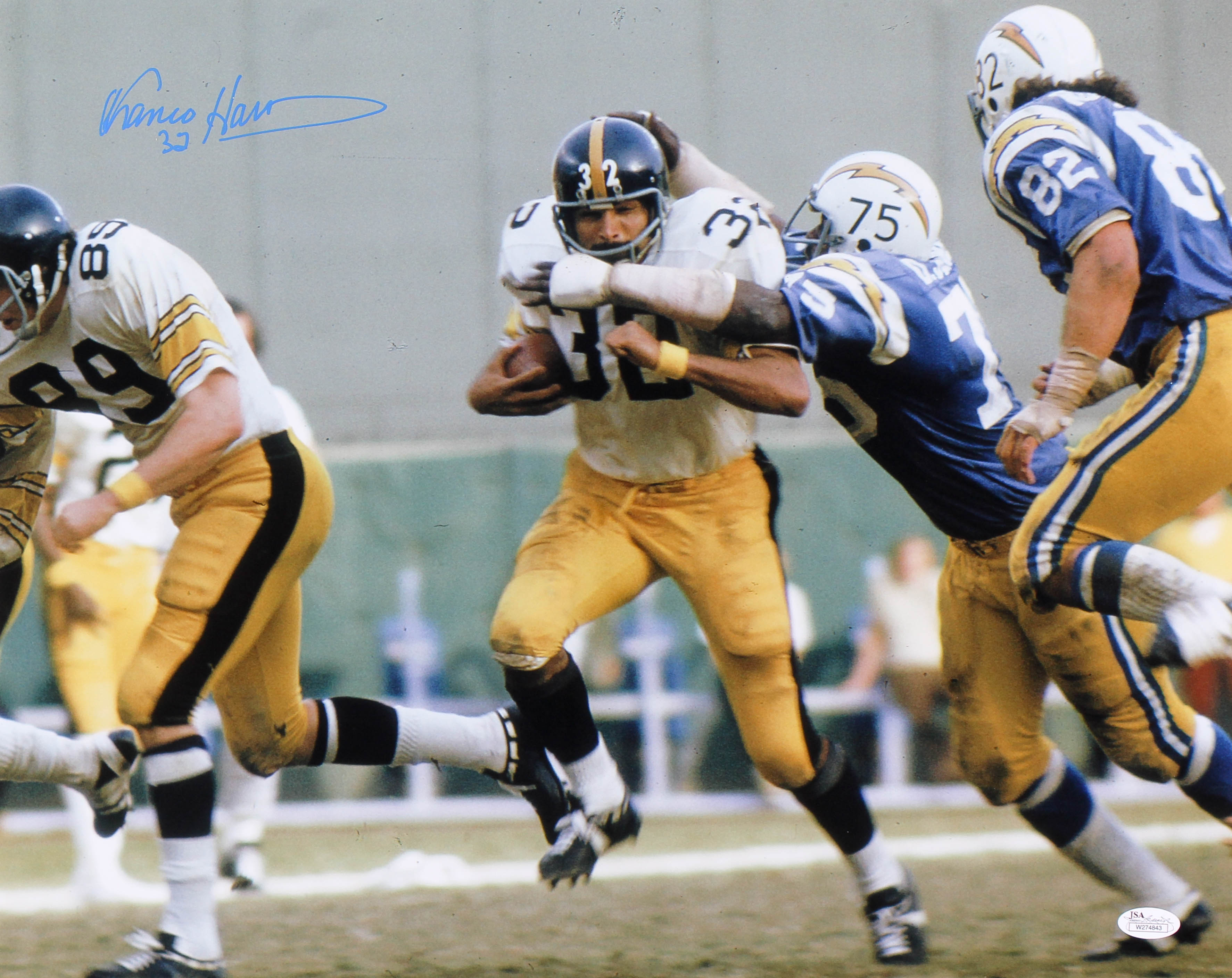 Photo measures 16" x 20" in size and has been hand-signed in blue felt tip pen by Franco Harris (HOF).