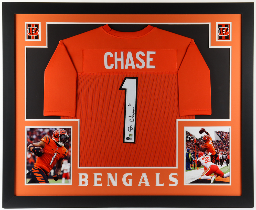 Custom frame measures 35" x 43" in size and features a jersey hand-signed by Ja'Marr Chase.
