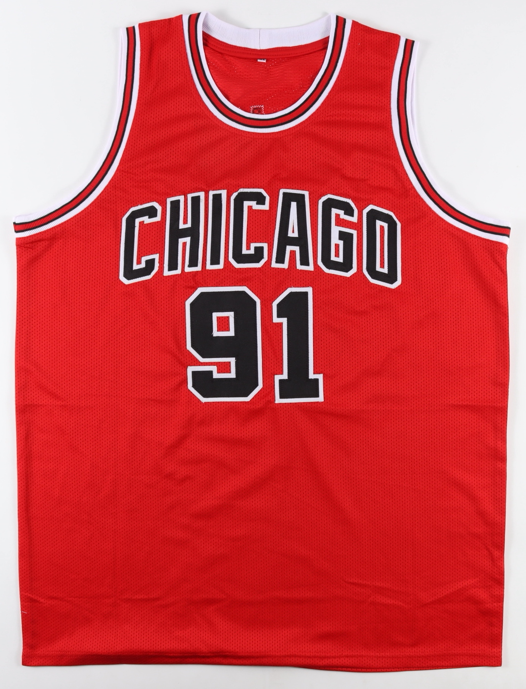 Custom on-court style jersey. Everything is sewn on, size XL. Hand-signed by Dennis Rodman (HOF).