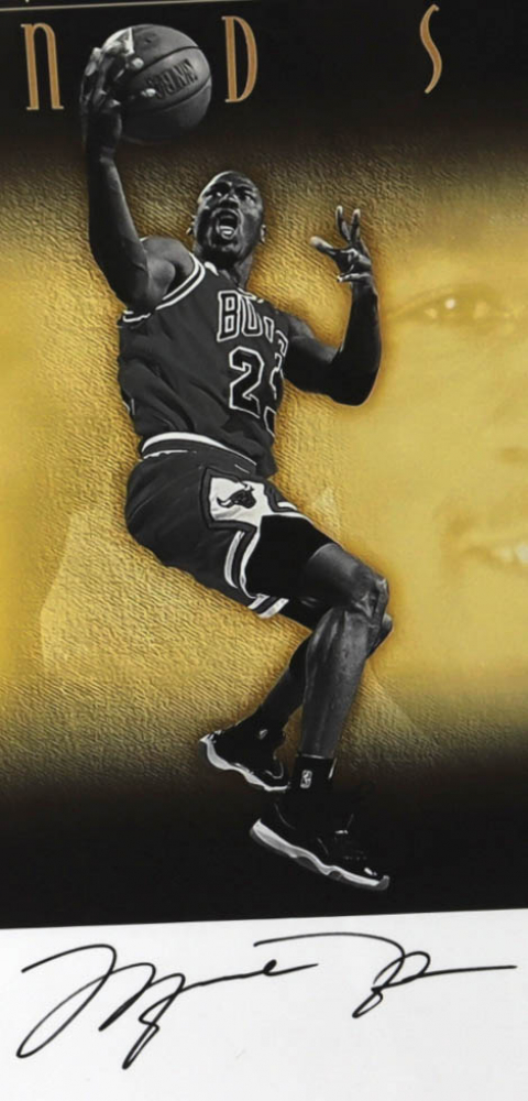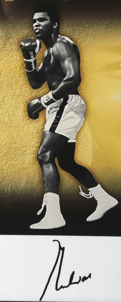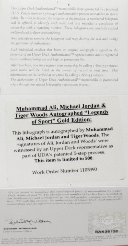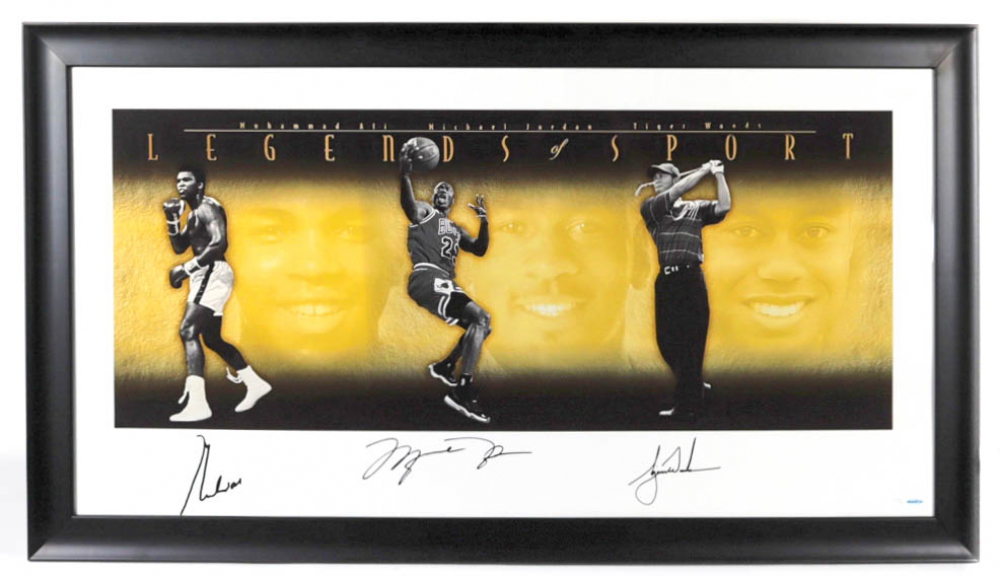 Custom frame measures 30.25" x 53.75" in size and features a lithograph that has been hand-signed by Muhammad Ali (D. 2016, HOF), Micheal Jordan (Chicago Bulls, HOF), and Tiger Woods (HOF). The lithograph is limited edition and hand-numbered #230/500.