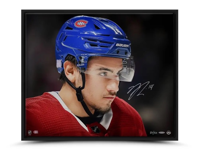 Frame measures 20" x 24" in size and features a photo on canvas that has been hand-signed by Nick Suzuki (Montreal Canadiens).