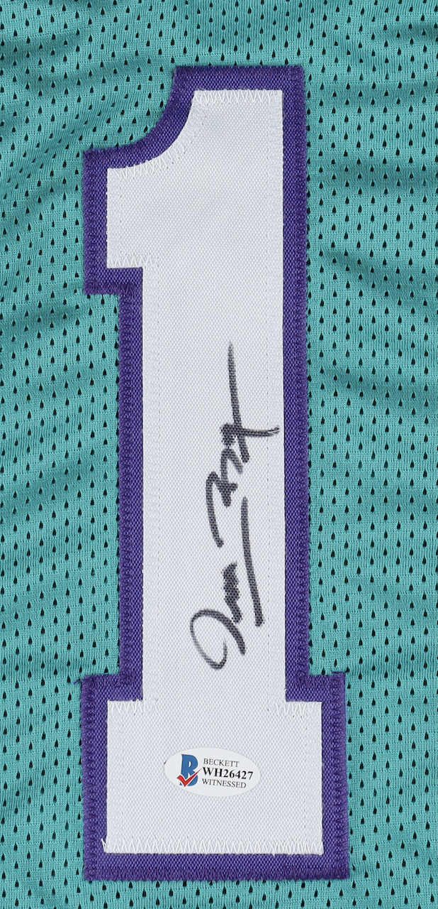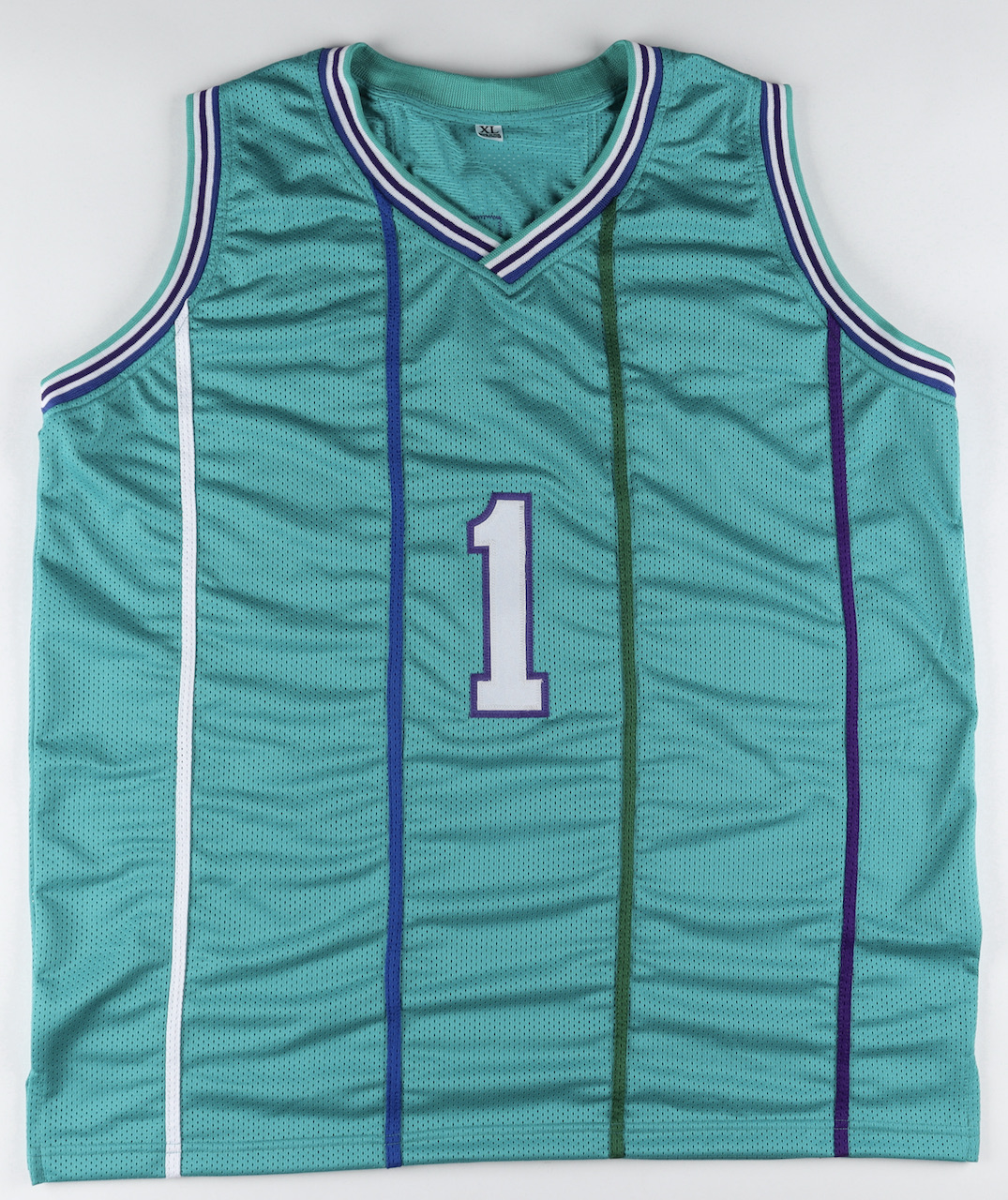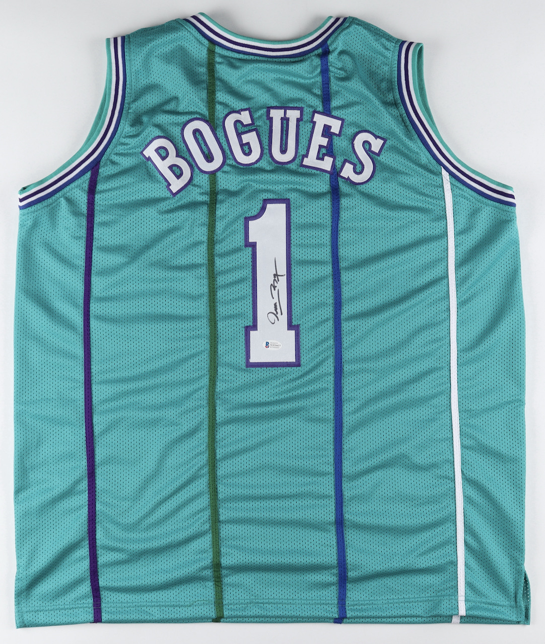 Custom on-court style jersey. Everything is sewn on, size XL. Hand-signed by Muggsy Bogues.