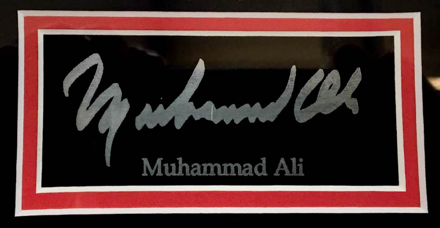 Custom framed display measures 20" x 24" in size and features an 11" x 14" Muhammad Ali. Display also includes an engraved name plate, please note the engraved signature is a facsimile. Display is unsigned. See photo for details regarding the condition of the frame.