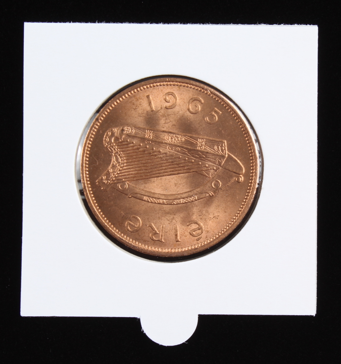 The scarce, pre-1969, large (half-dollar-size) penny shows classic harp and hen-and chicks motifs. In uncirculated condition, it is an enduring source of good luck.