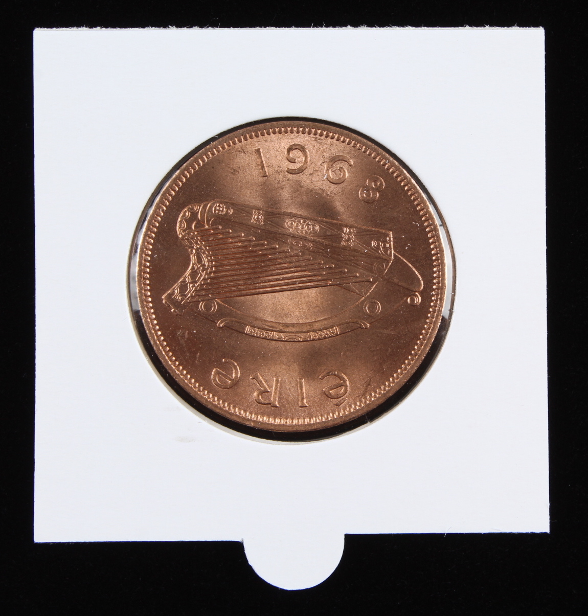 The scarce, pre-1969, large (half-dollar-size) penny shows classic harp and hen-and chicks motifs. In uncirculated condition, it is an enduring source of good luck.