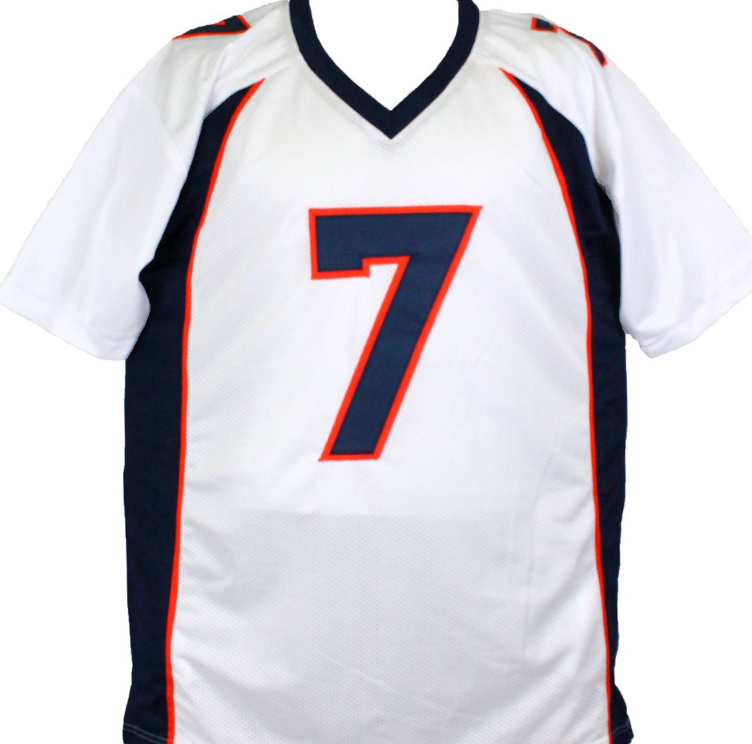 Jersey with everything sewn on, size XL. Hand-signed by John Elway (HOF). Elway's career highlights have been custom stitched onto the back of the jersey below the reverse number.