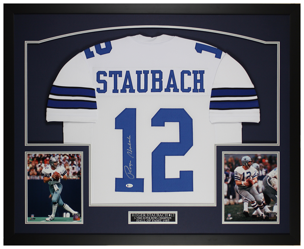 Custom frame measures approximately 35" x 43" in size. Display features a jersey hand-signed by Roger Staubach (HOF).