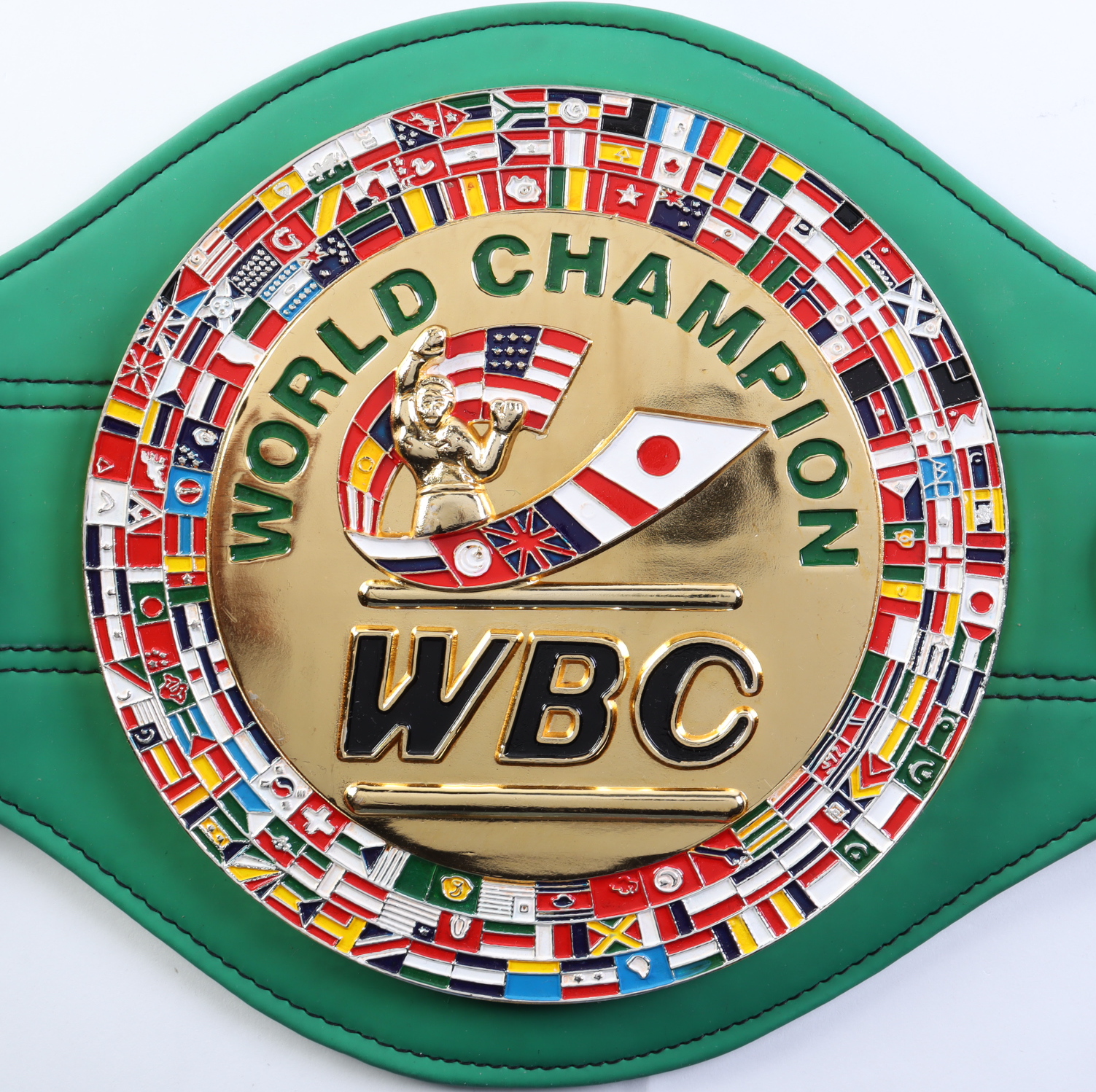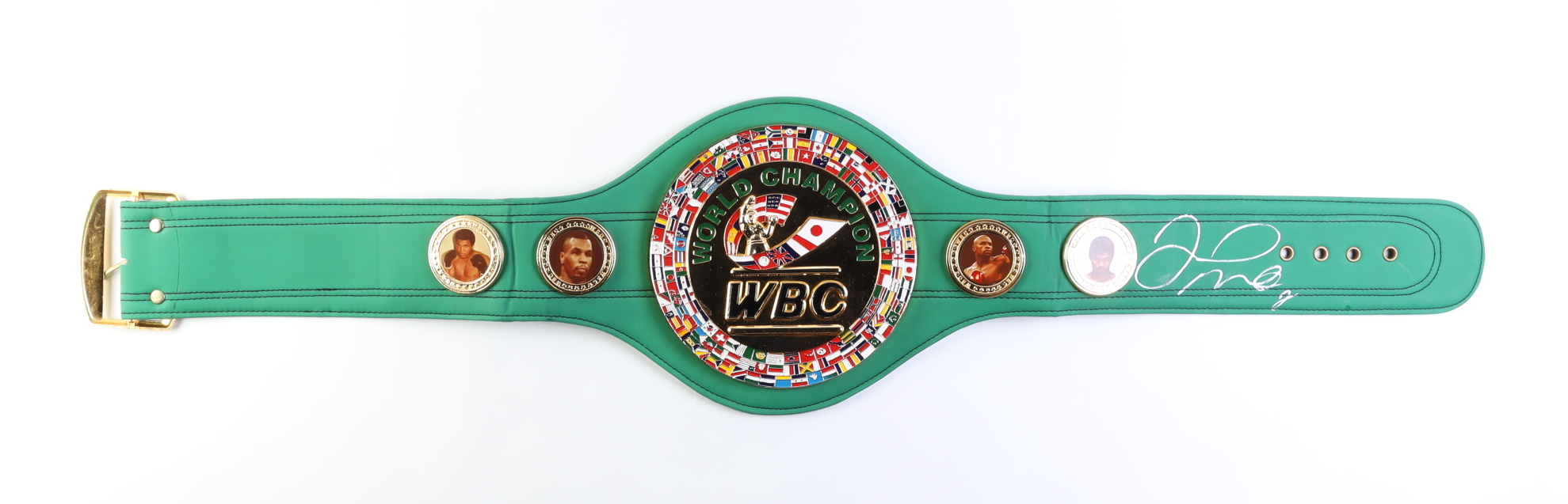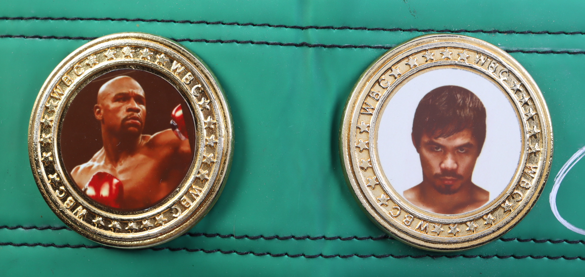 World Boxing Championship replica belt. Measures approximately 49" in length. Hand-signed by Floyd Mayweather Jr. (HOF). Please note, there are signs of wear on the inside of the belt.