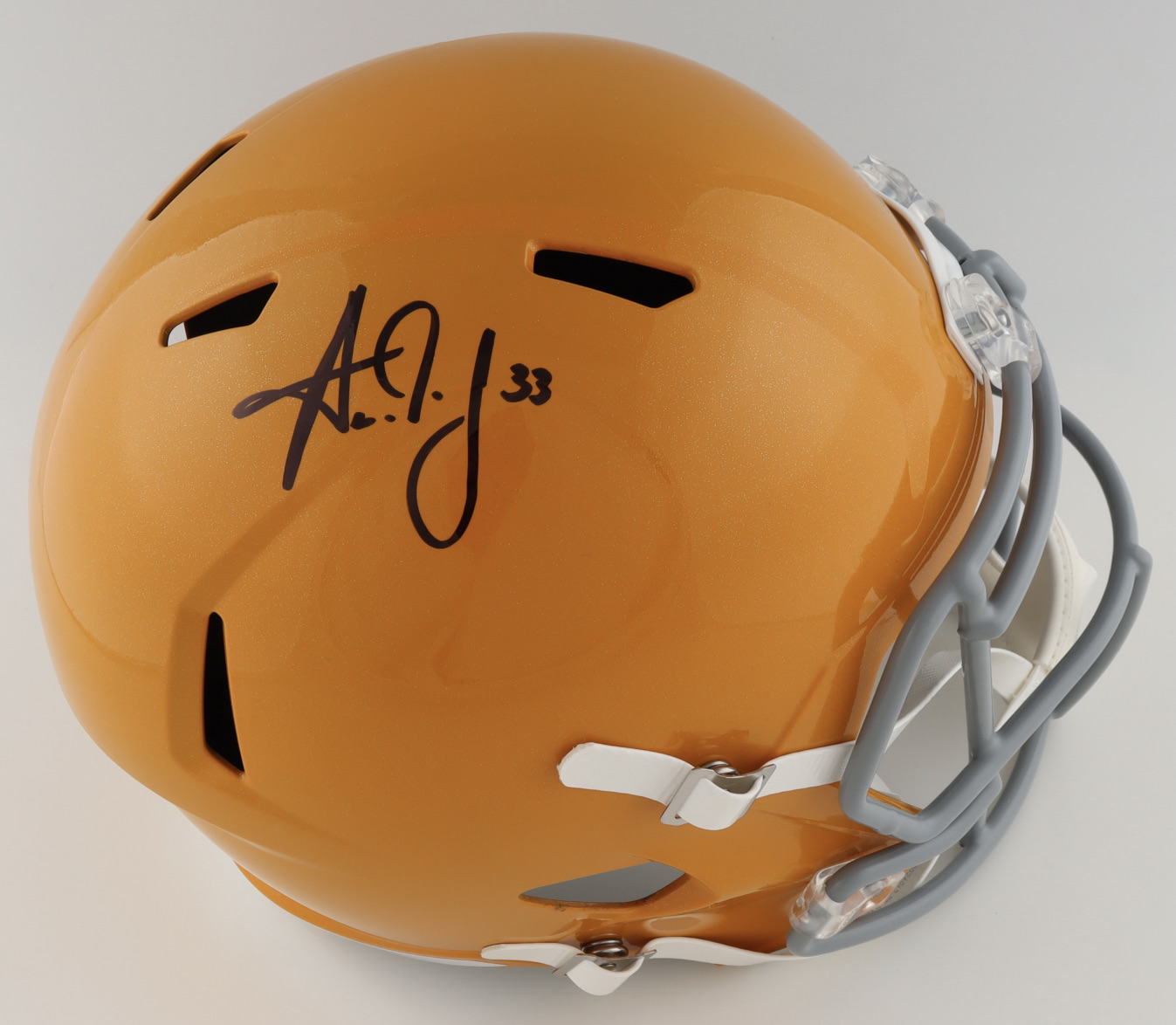Riddell Green Bay Packers Full-Size Replica Throwback Speed Helmet. Hand-signed by Aaron Jones.