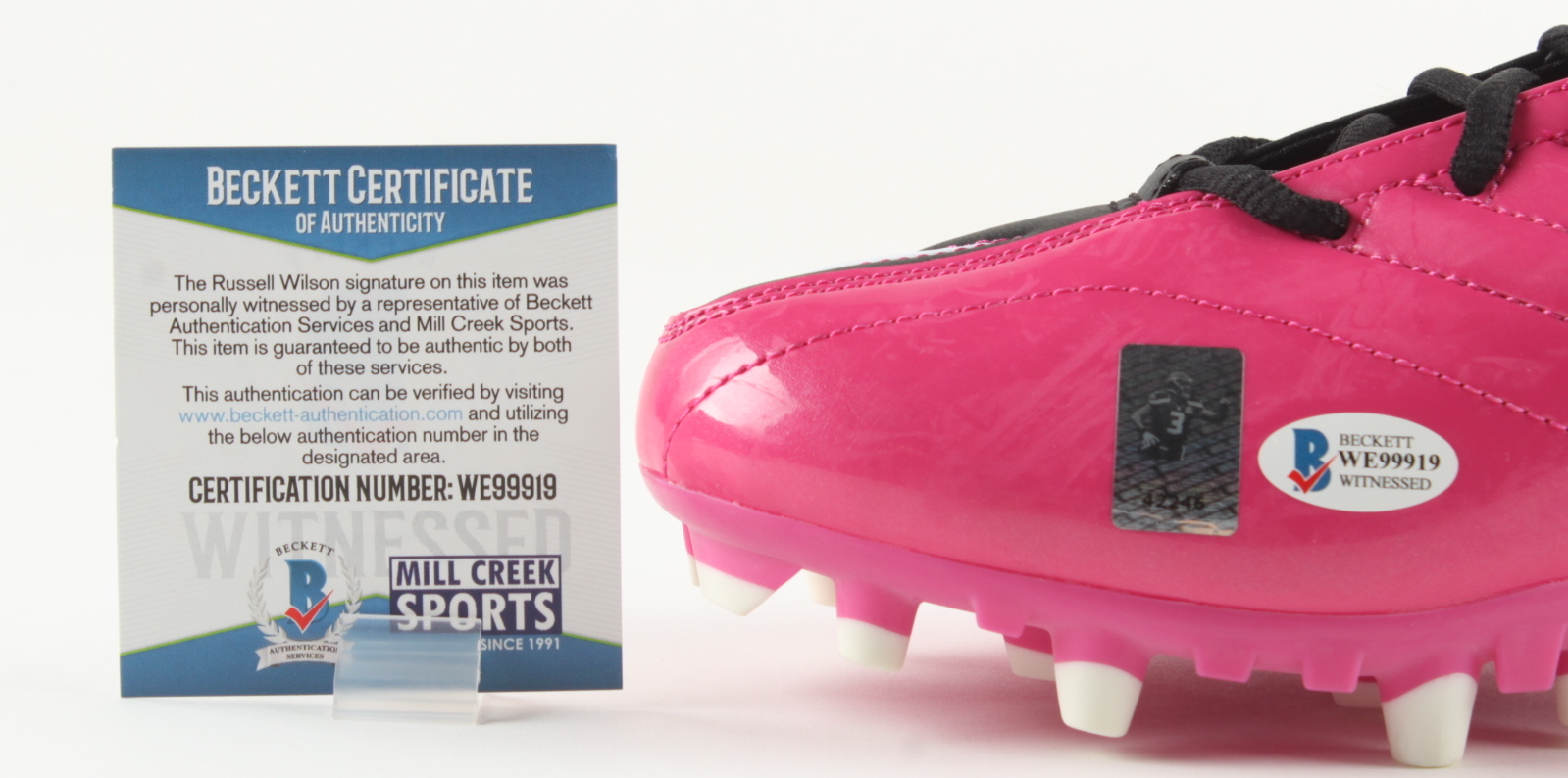 The lot / autograph(s) includes an official Beckett Authentication Services serially-numbered hologram and matching COA for authenticity purposes. The signing of this item was witnessed by Beckett. As well as an official Russell Wilson serially numbered hologram and matching COA for authenticity purposes.