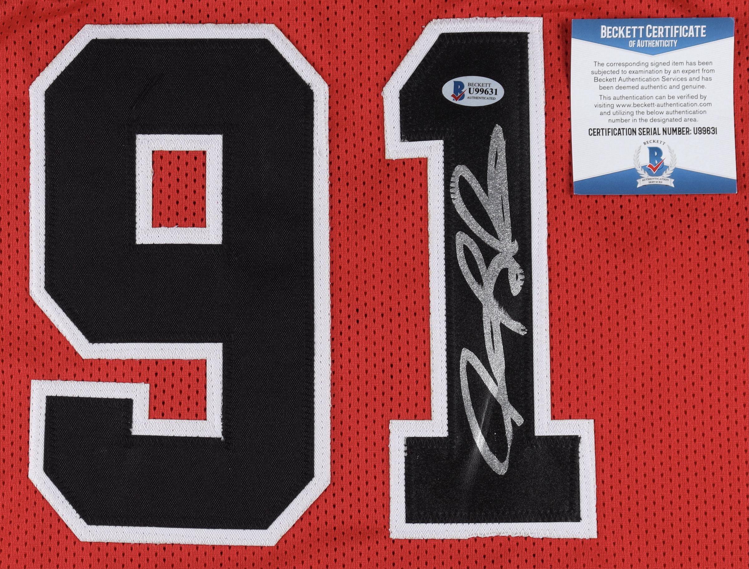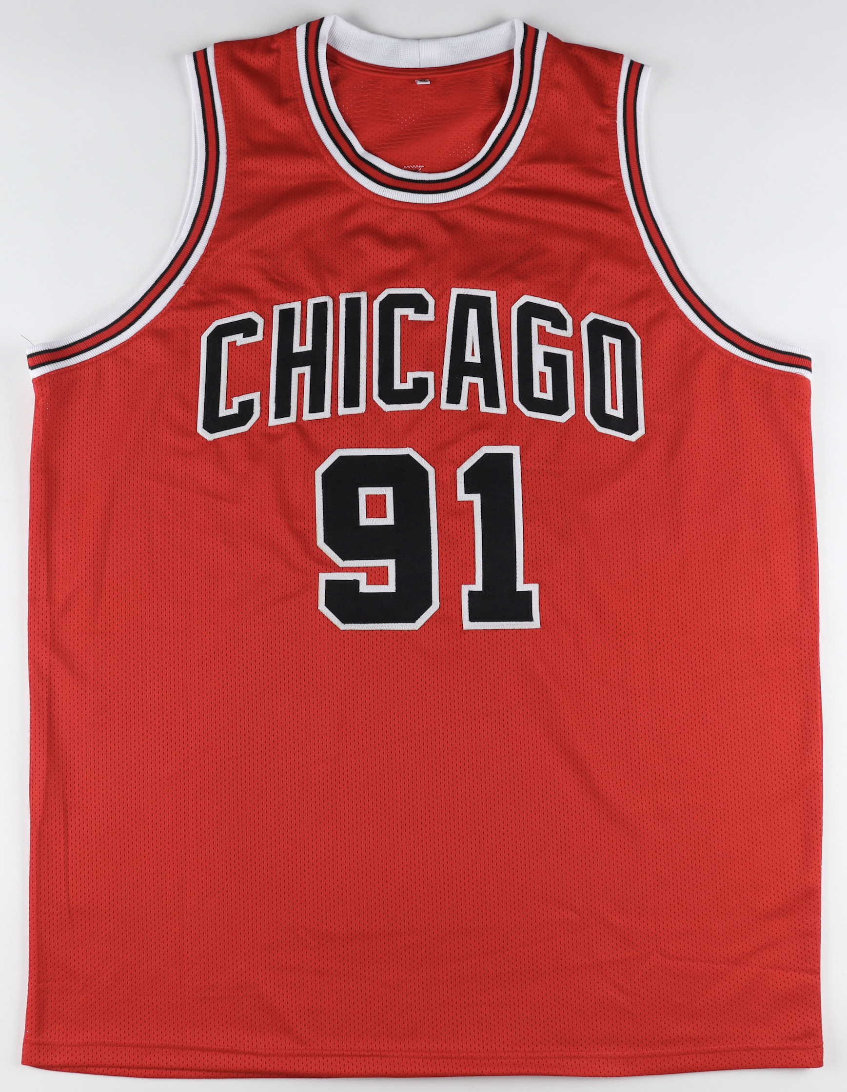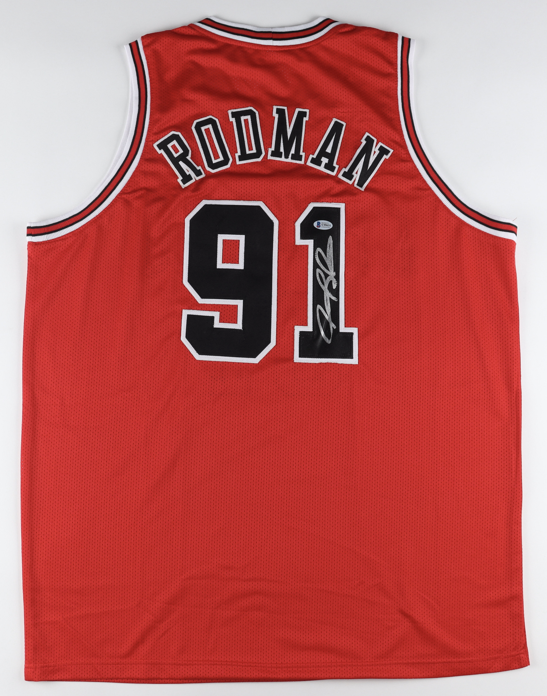 Custom on-court style jersey. Everything is sewn on, size XL. Hand-signed by Dennis Rodman (HOF).