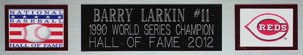 Custom framed display measures 35" x 43" in size and features a custom on-field style jersey that has been hand-signed by Barry Larkin (Cincinnati Reds, HOF).