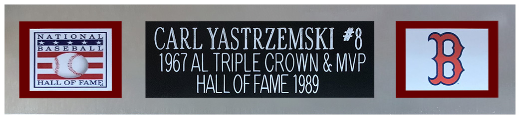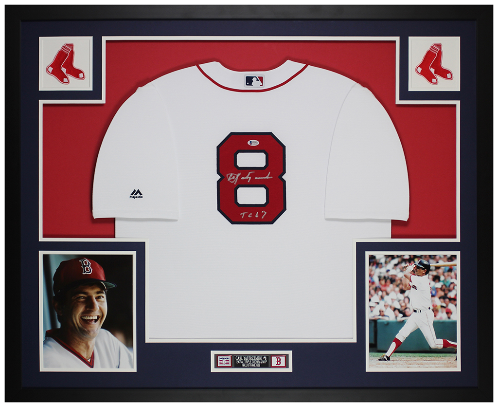 Custom framed display measures 35" x 43" in size and features a Majestic on-field style jersey that has been hand-signed and inscribed by Carl Yastrzemski (Boston Red Sox, HOF).
