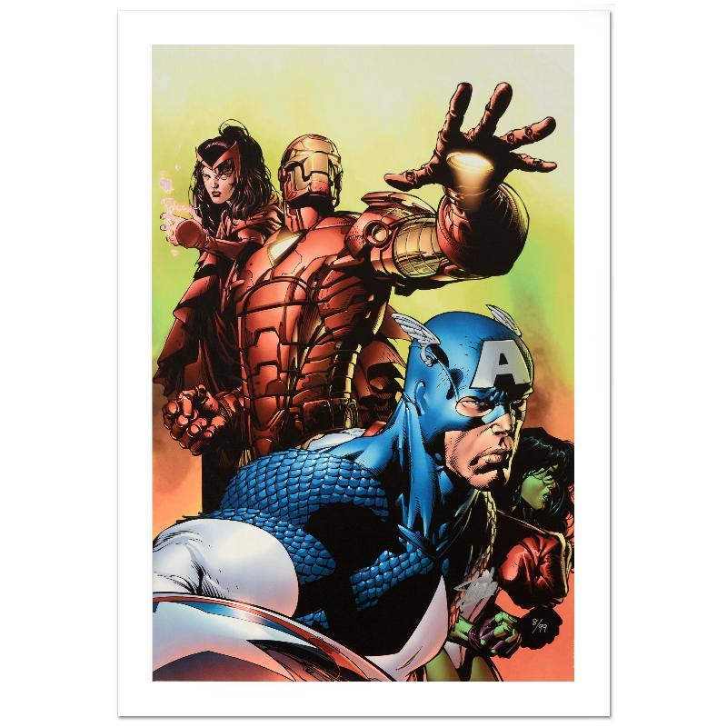 A piece of comic book history, this limited edition, from original art by David Finch, depicts the heroic Scarlet Witch, Captain America, Iron Man, and She-Hulk. In 2003, Finch came to Marvel Comics for a year-long arc on Ultimate X-Men, after which he began work on The Avengers and thereafter The New Avengers. He has also worked on such titles as Captain America, Spider-Man and the Hulk.