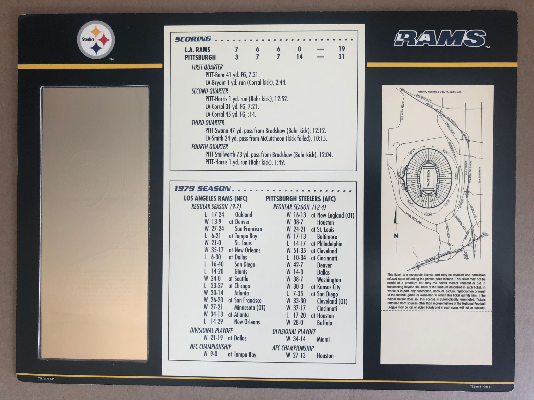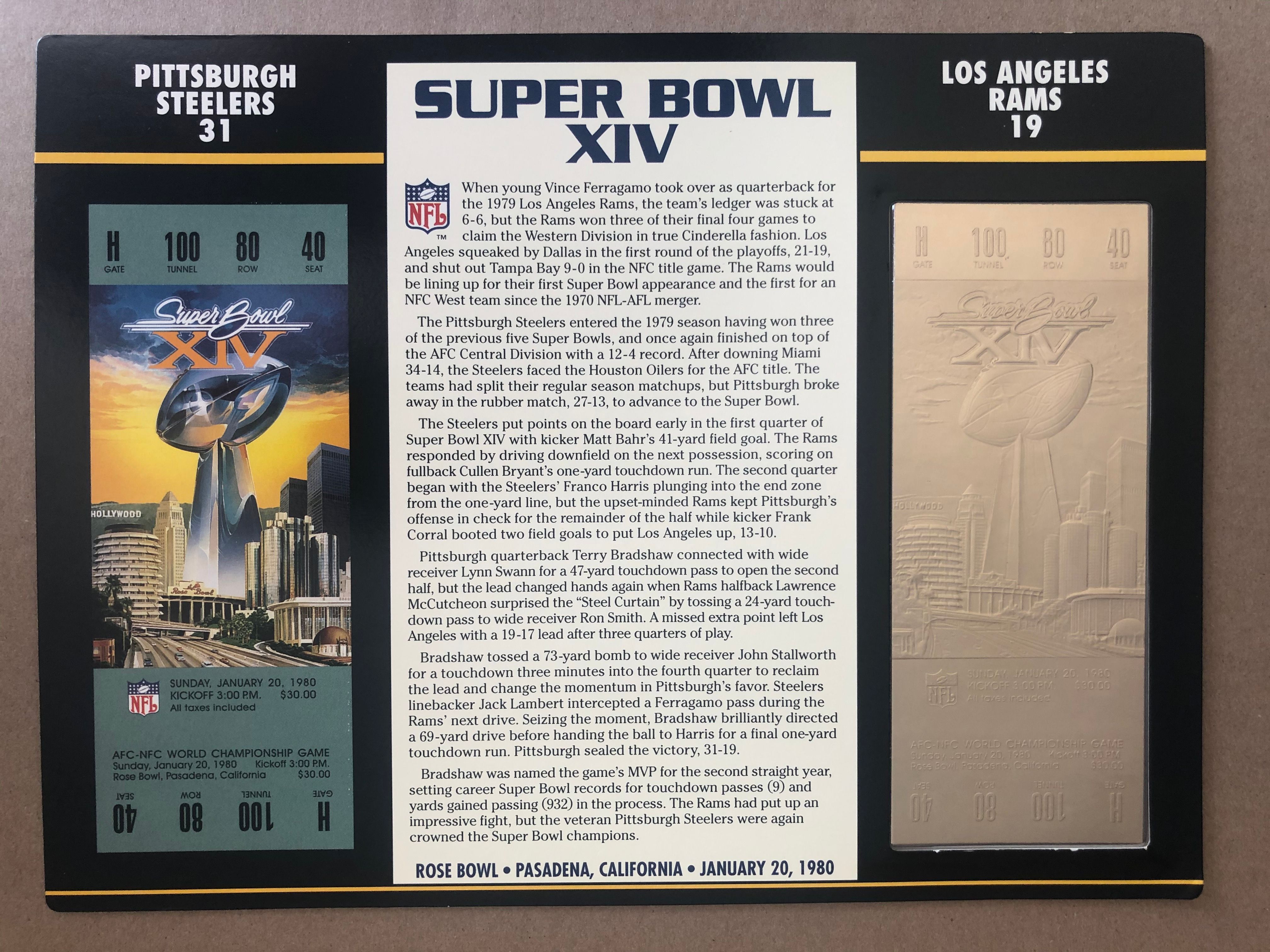 1980 Commemorative Super Bowl XIV Card with Ticket: Steelers vs Rams