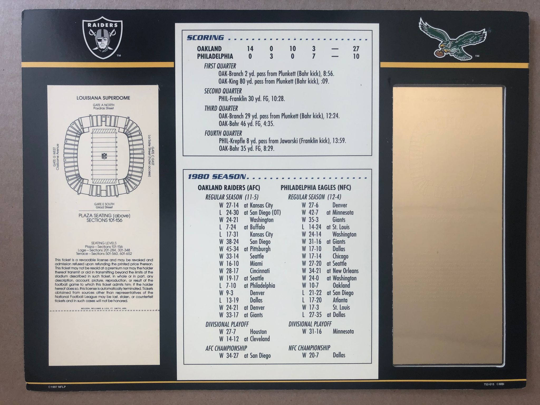 1981 Commemorative Super Bowl XV Card with Ticket: Raiders vs Eagles