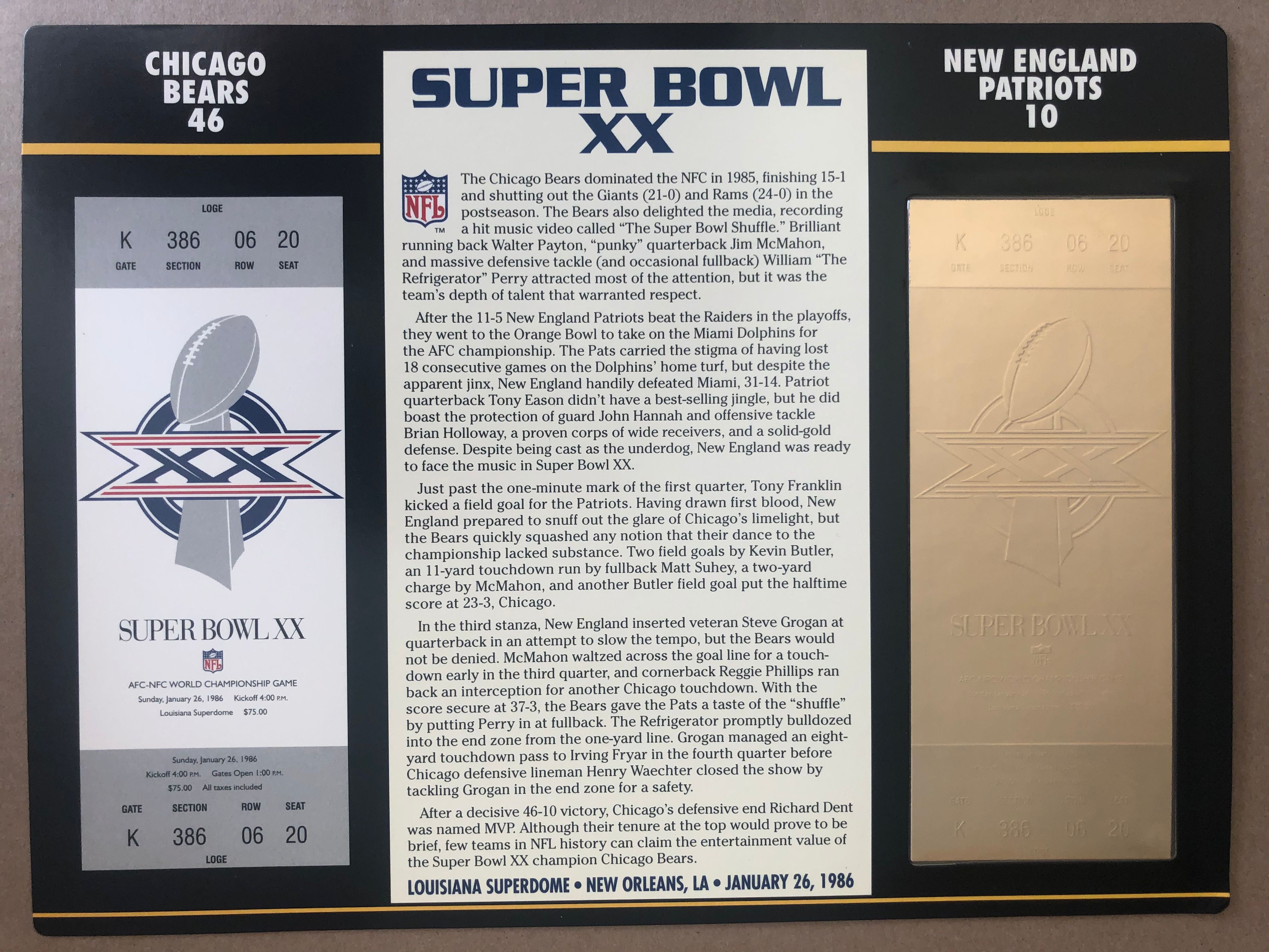 1986 Commemorative Super Bowl XX Card with Ticket: Bears vs Patriots