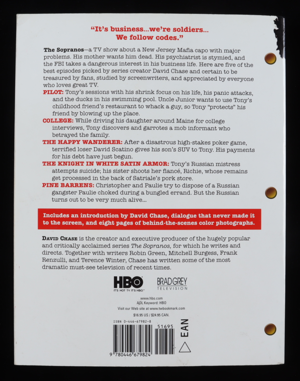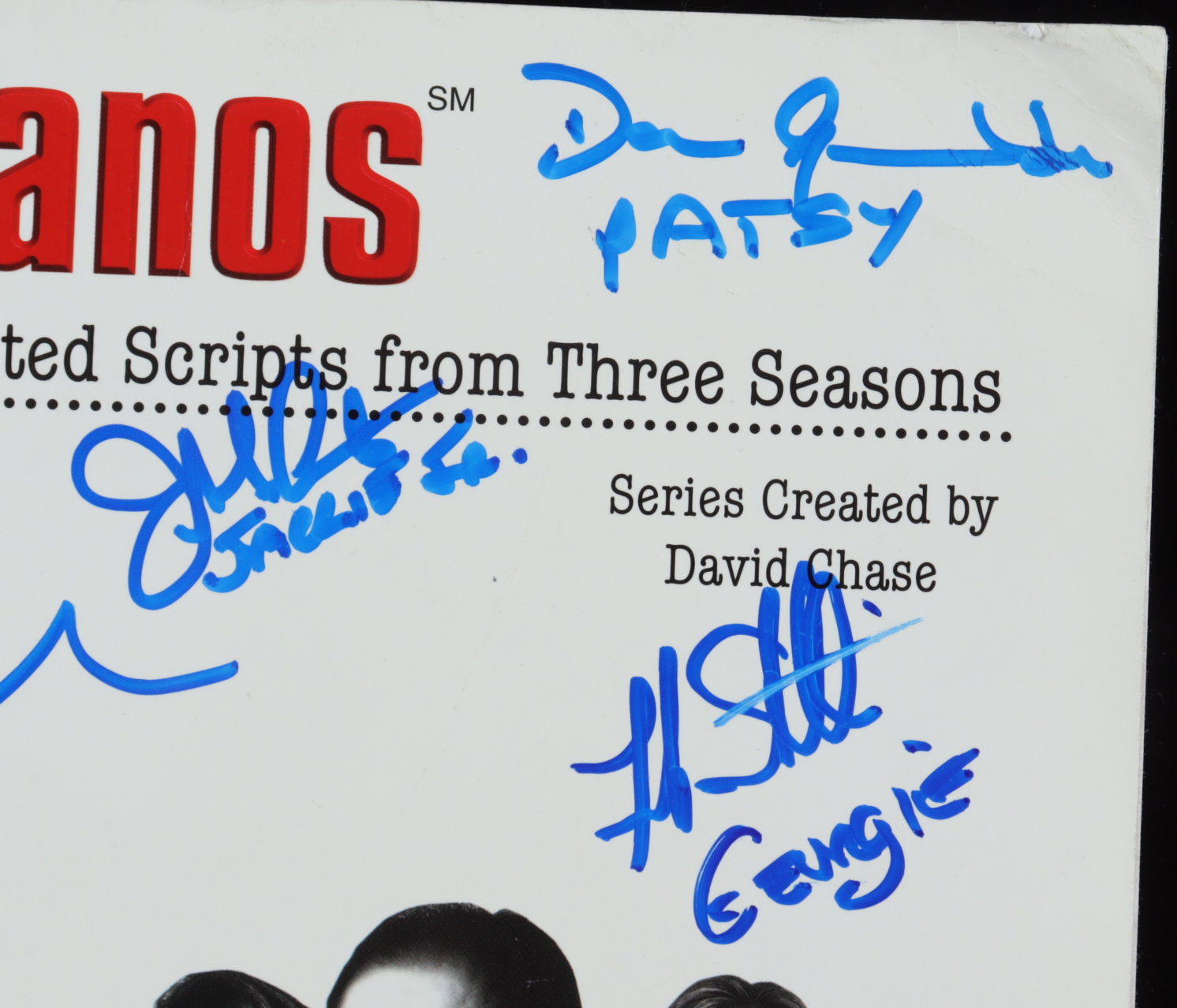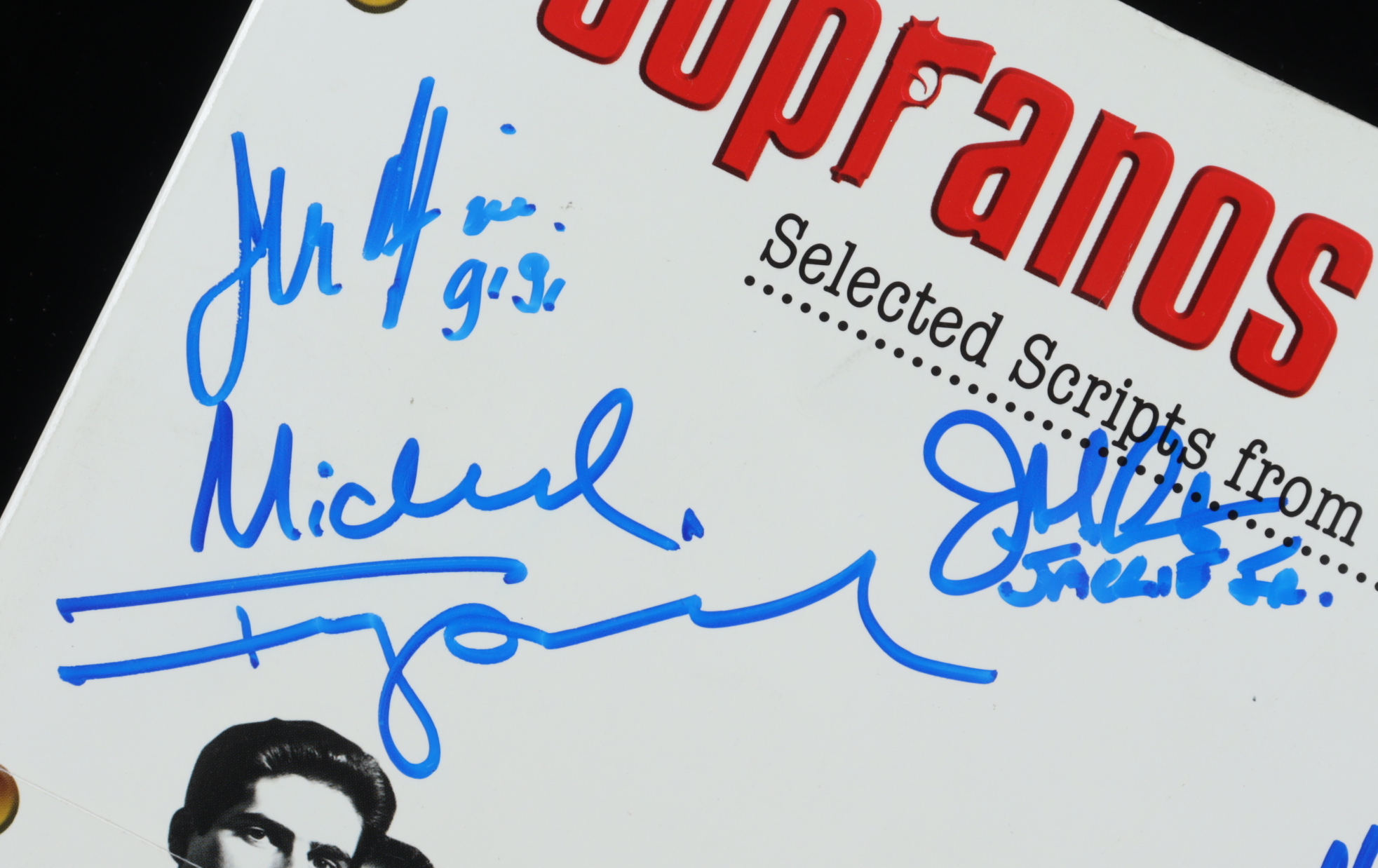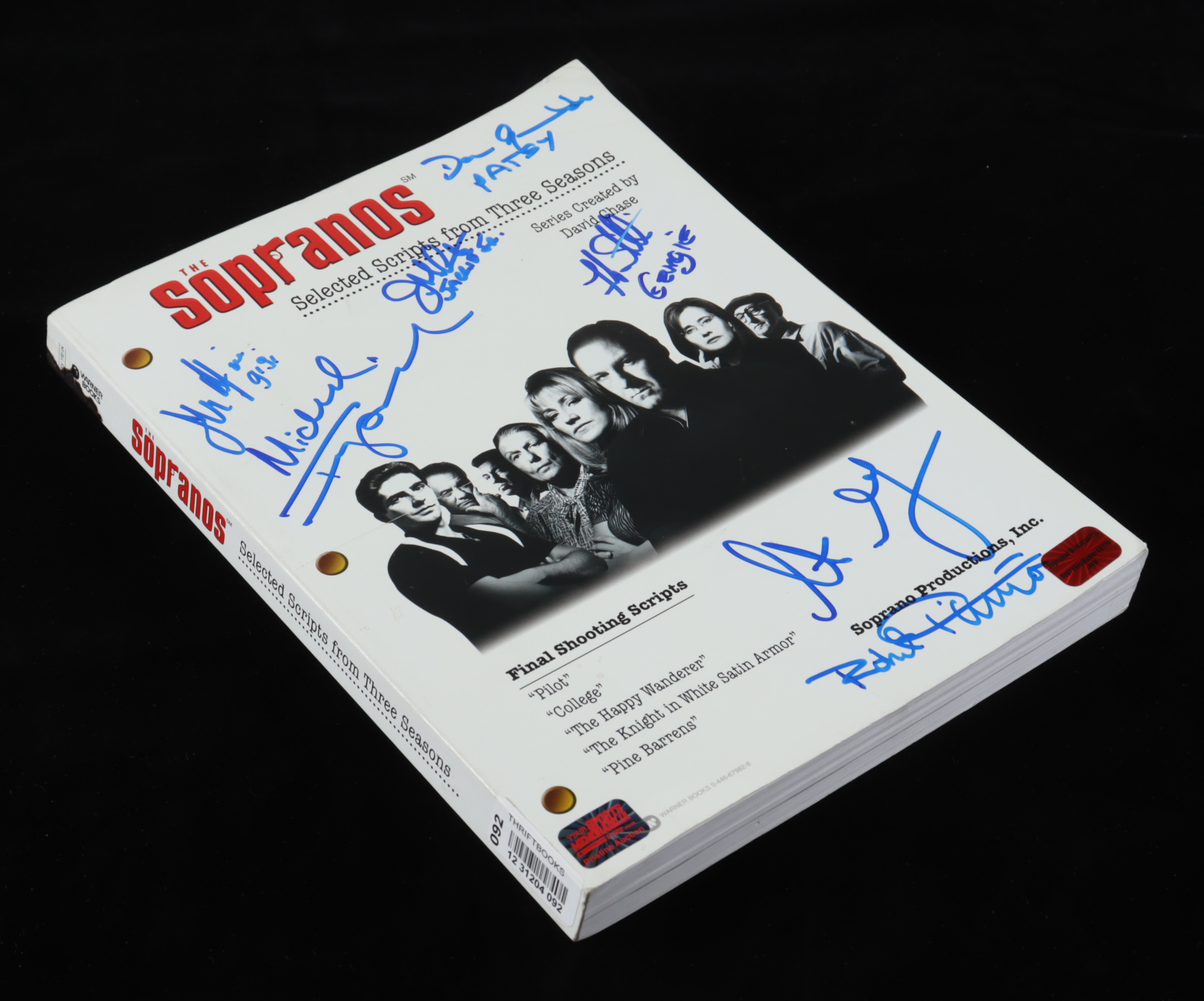 Selected script book features the final shooting scripts from three seasons and has been hand-signed and inscribed on the cover by (7) with Frank Santorelli (Georgie), Dan Grimaldi (Patsy Parisi), Jason Cerbone (Jackie Aprile Jr.), John Fiore (Gigi Cestone), Robert Funaro (Eugene Pontecorvo), Steve Schirripa (Bobby 'Bacala' Baccalieri) and Michael Imperioli (Christopher Moltisanti). Please note, there is a small stain on the back of the book, in the upper right-hand corner.