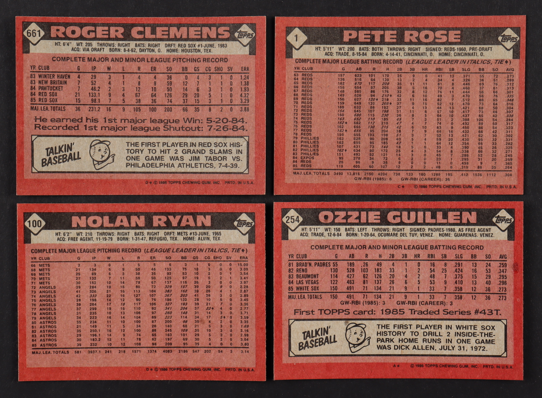 1986 Topps Baseball Complete Set of (792) Cards with Roger Clemens #661, Pete Rose #1, Nolan Ryan #100, Ozzie Guillen #254 RC