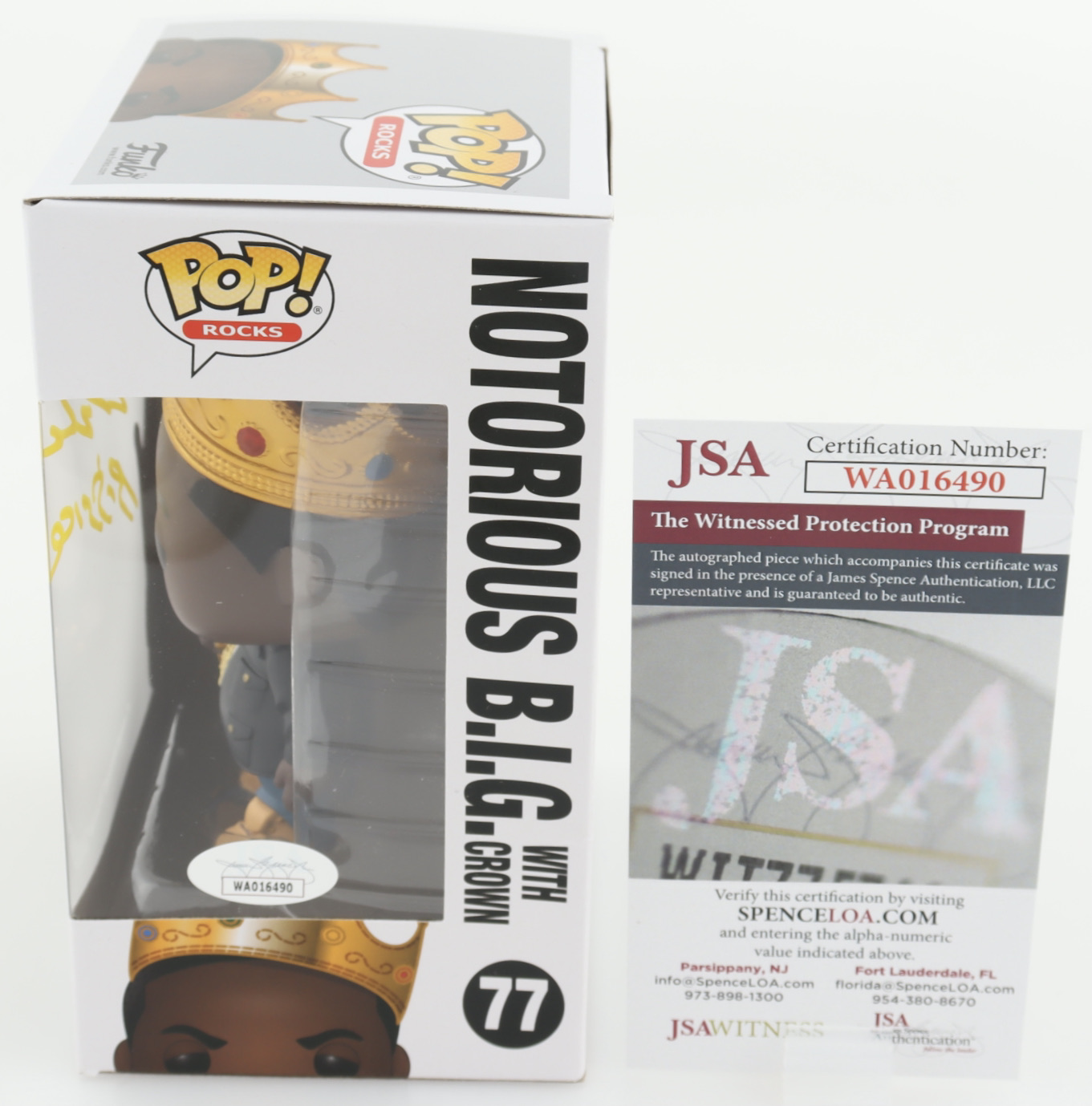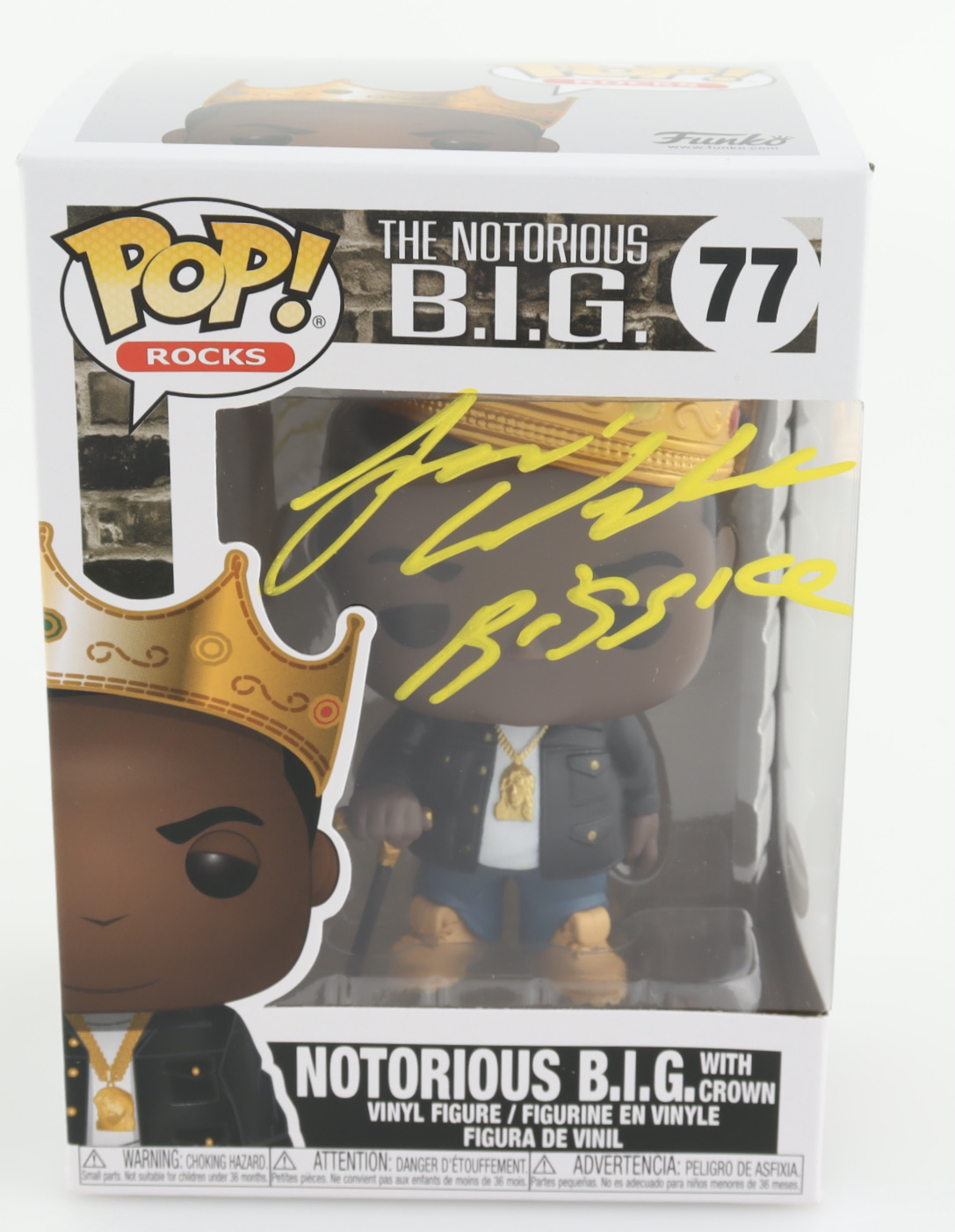 Funko Pop! vinyl figure measures approximately 4" tall. Hand-signed and inscribed on the packaging by Jamal Woolard.