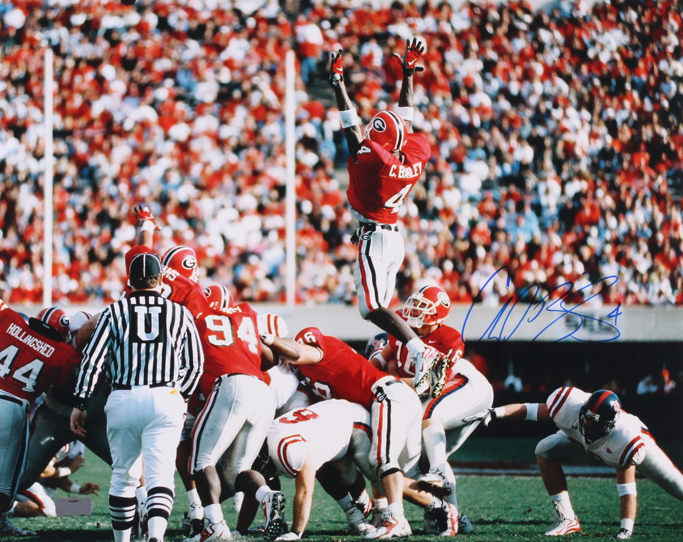 Photo measures 16" x 20" in size and has been hand-signed in blue felt-tip pen by Champ Bailey (Broncos).