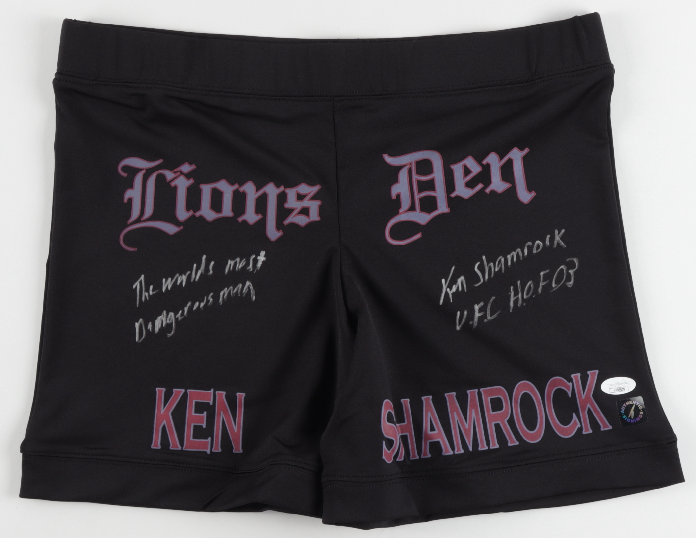 Ken Shamrock Signed UFC Shorts Inscribed "The Worlds Most Dangerous Man" & "U.F.C. H.O.F. 03" (JSA & Authentic Signings)