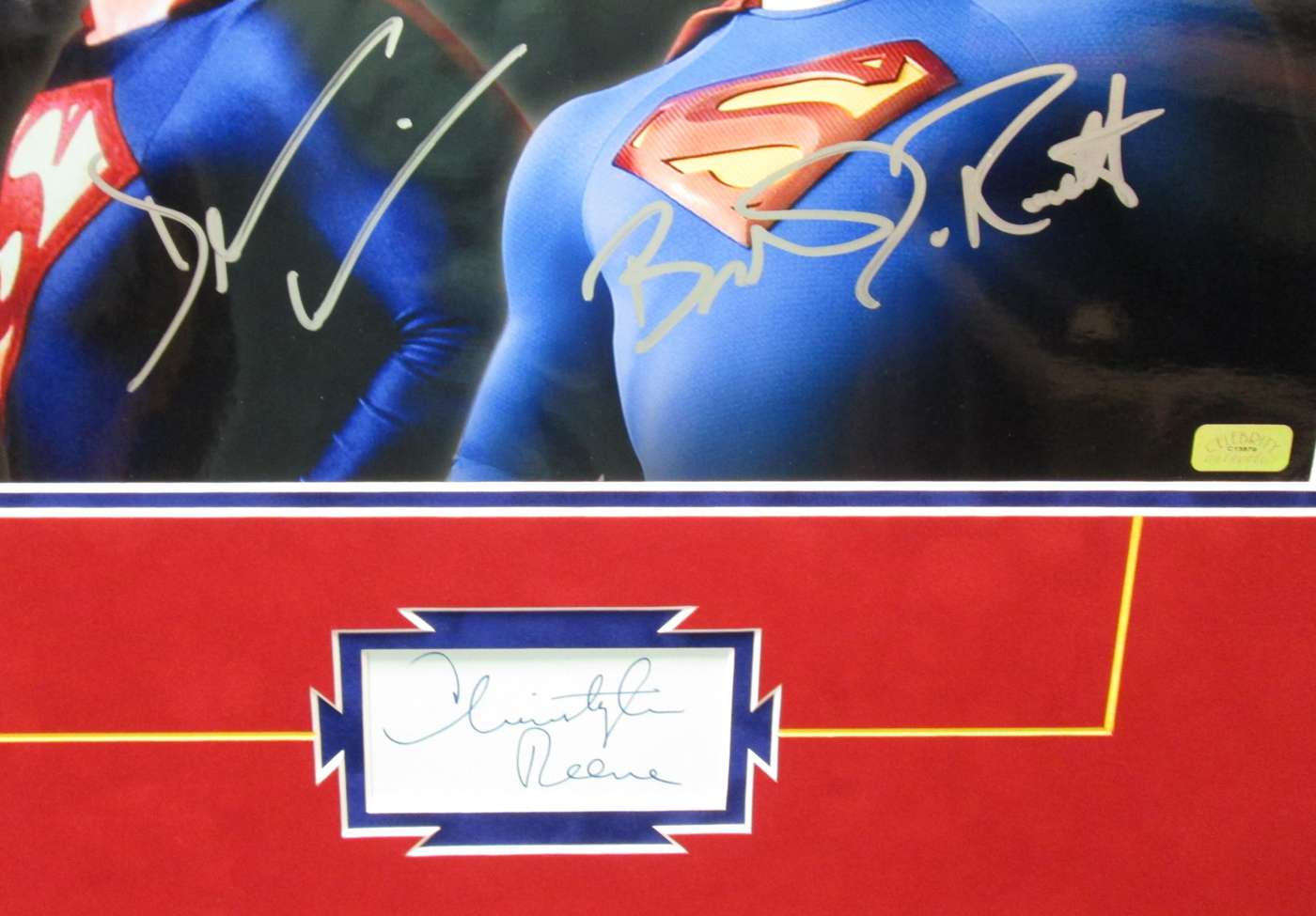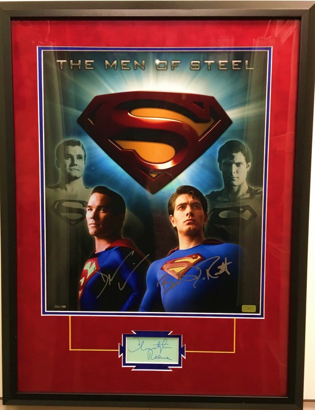 Custom framed display with acid-free mats and premium plexi glass measures 22" x 29" in size and has been hand-signed by Christopher Reeve (D 2004), Brandon Routh and Dean Cain.