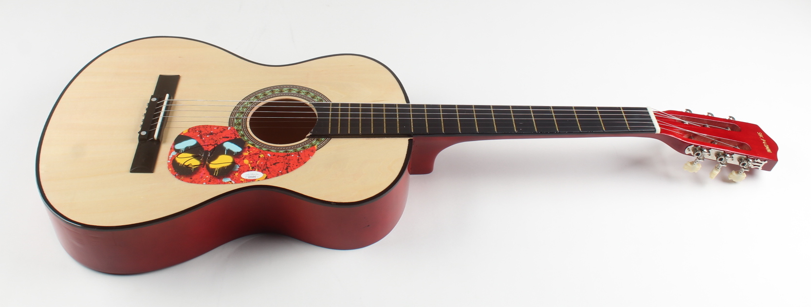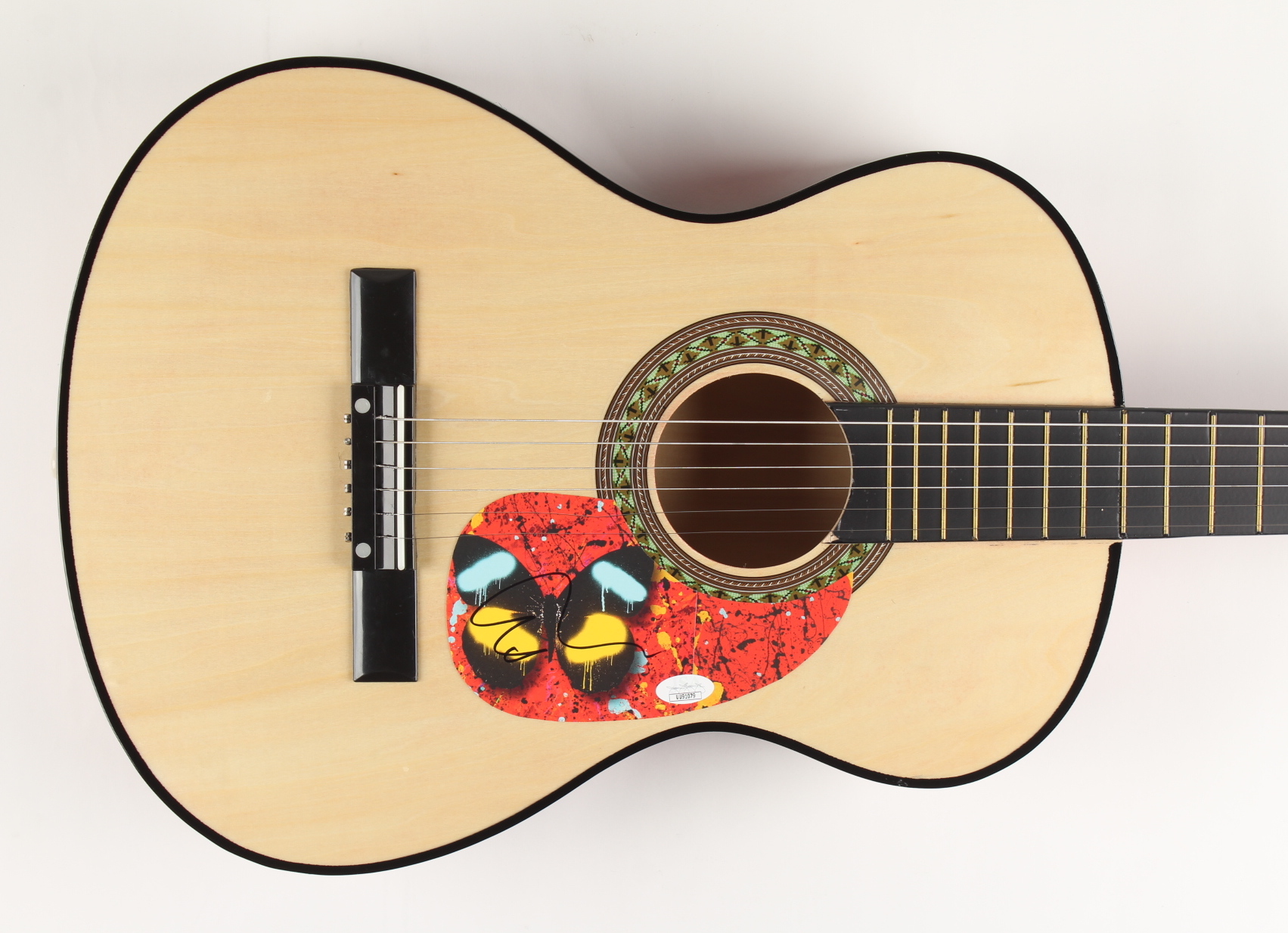 Acoustic guitar measures approximately 38" in length. Hand-signed by Ed Sheeran on a CD cover that has been repurposed as a pick-guard.