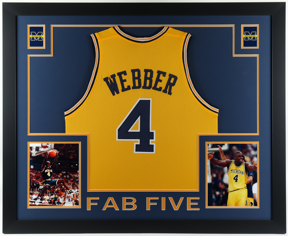Custom frame measures 35" x 43" in size and features a jersey from Chris Webber. Please note, the display is unsigned.