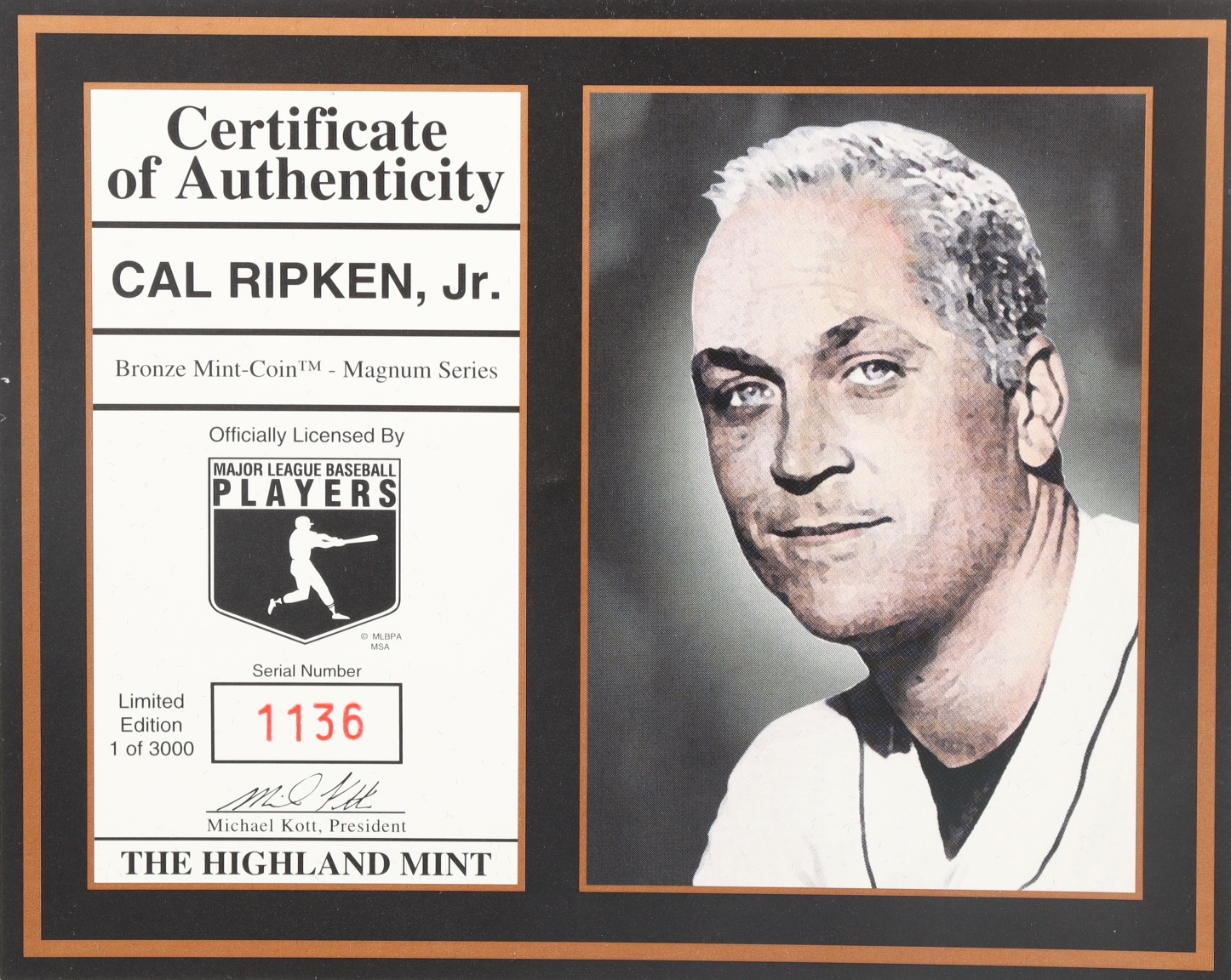 Cal Ripken Jr. bronze commemorative coin includes case along with COA. Produced by the Highland Mint. The coin is limited edition and has been numbered #1,136/3,000. Please see photos for additional details regarding the condition of the coin.