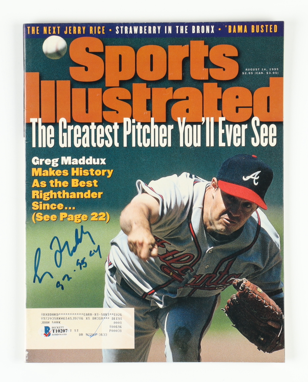 August 14, 1995 issue of Sports Illustrated Magazine. Hand-signed and inscribed by Greg Maddux (Atlanta Braves, HOF).
