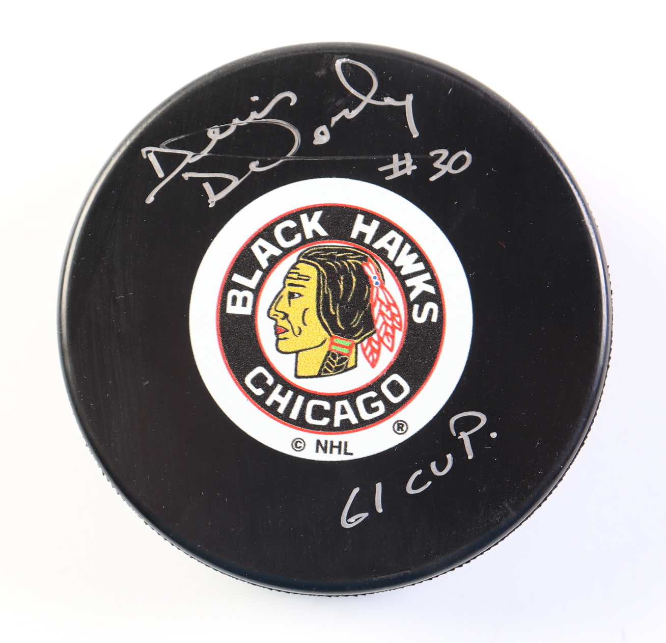 Chicago Black Hawks logo hockey puck has been hand-signed and inscribed by Denis DeJordy.