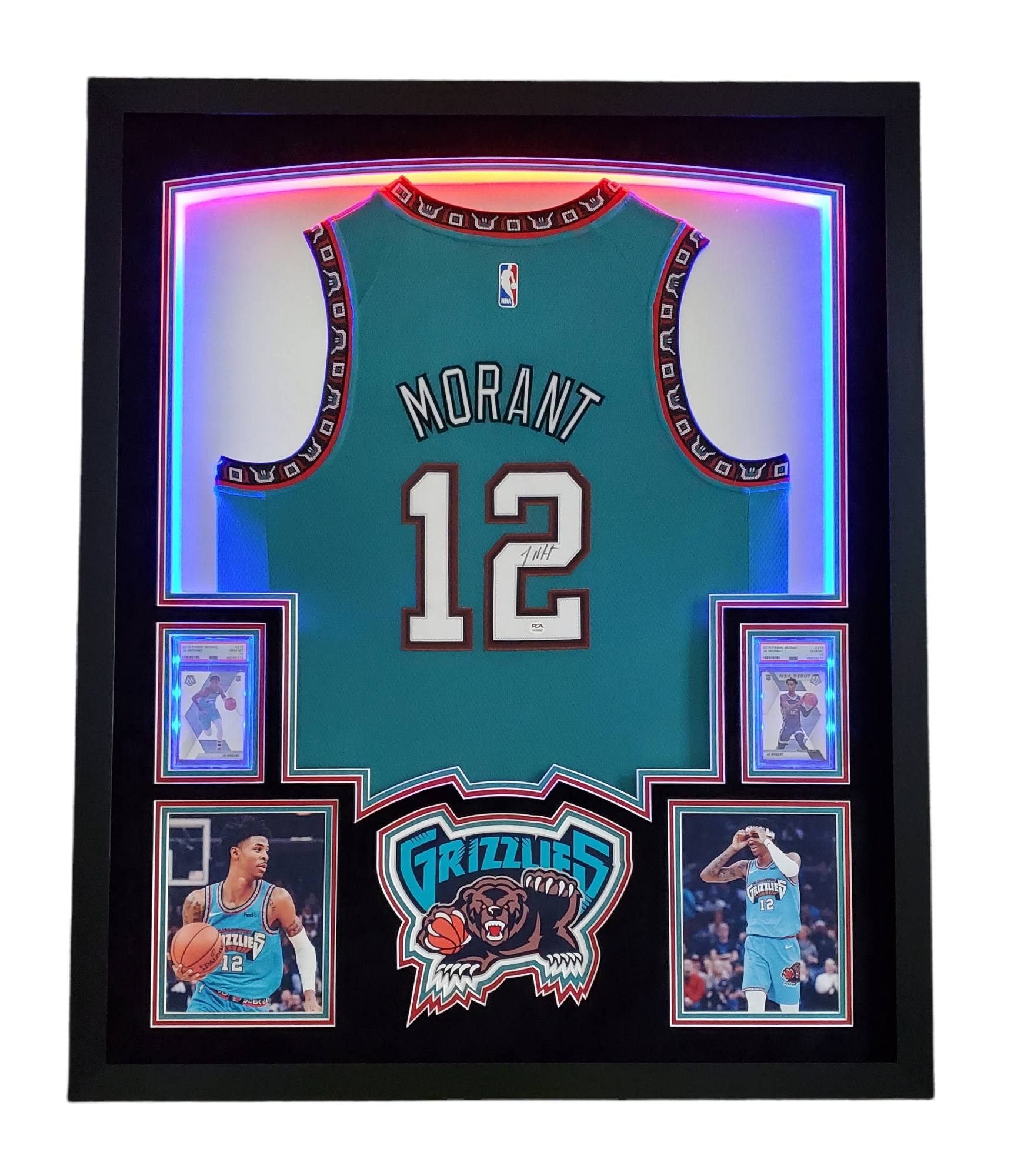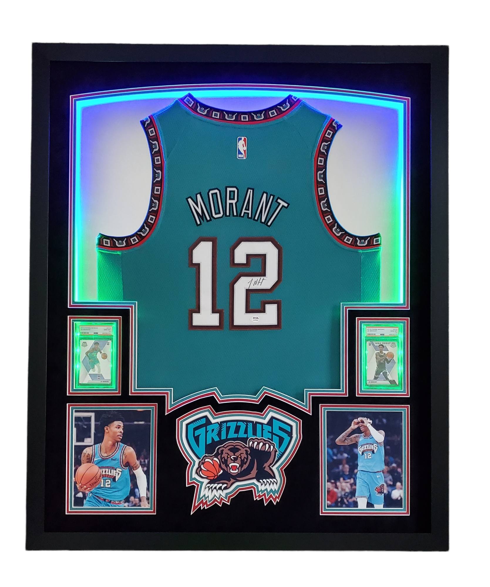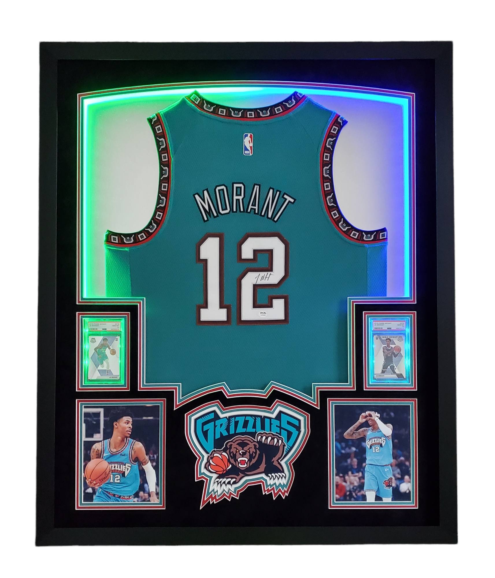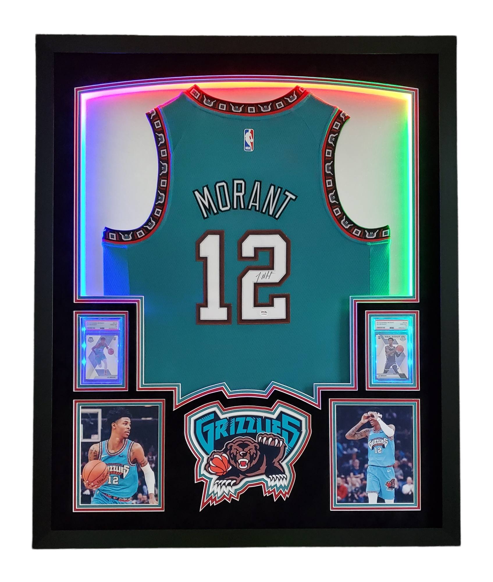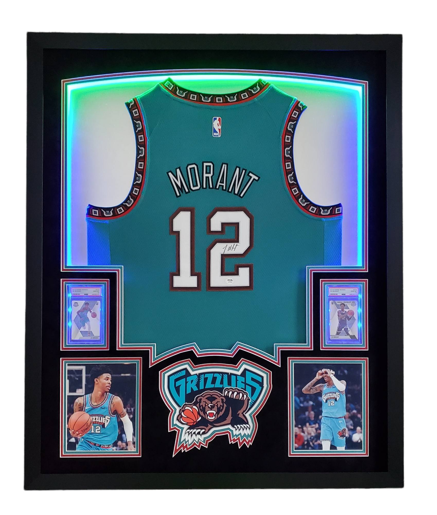 Custom frame measures 34" x 42" in size and features a on-court style jersey that has been hand-signed by Ja Morant (Memphis. Grizzlies). Display also includes (2) 8" x 10" photos. The frame includes embedded USB-powered LED lights.