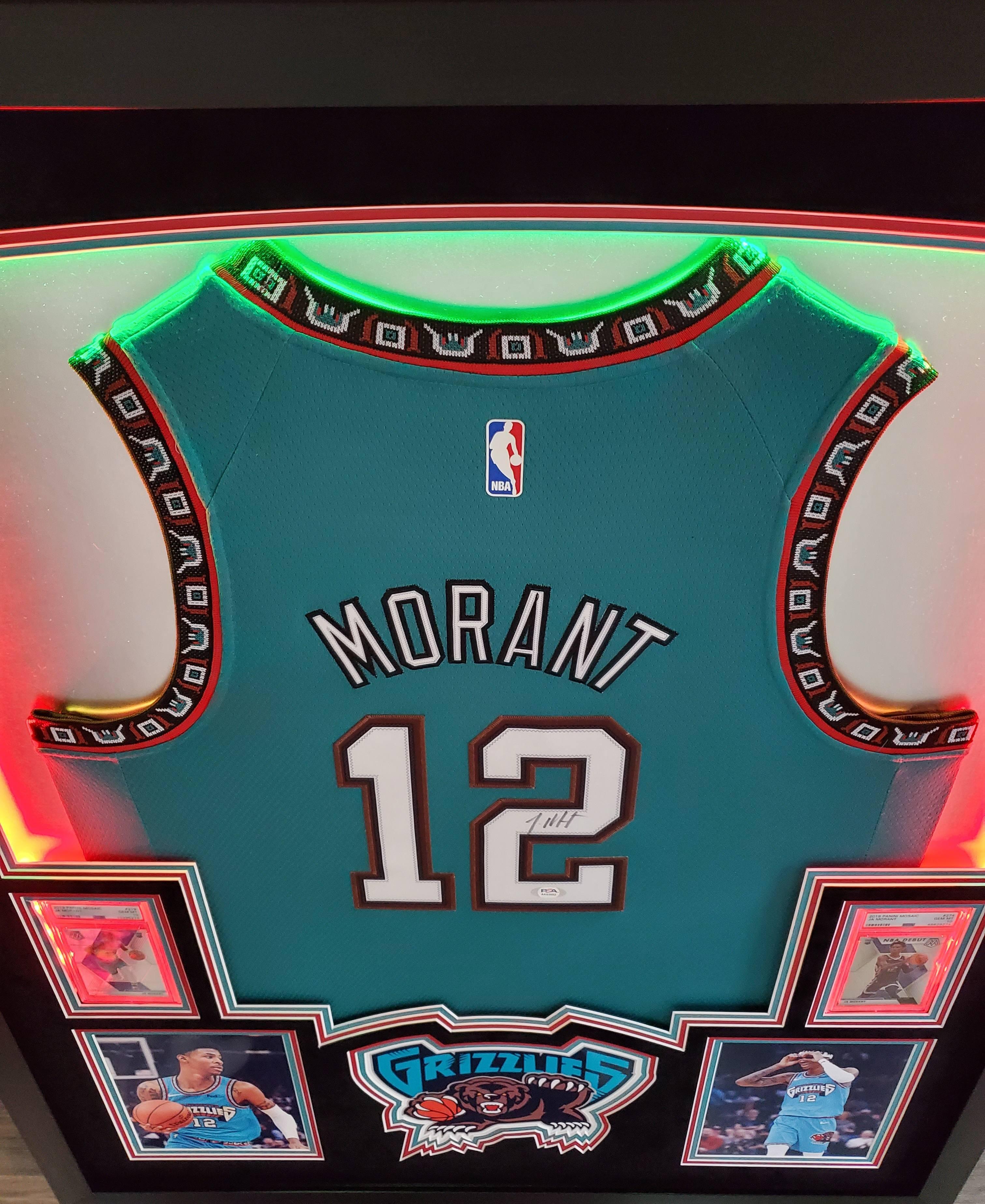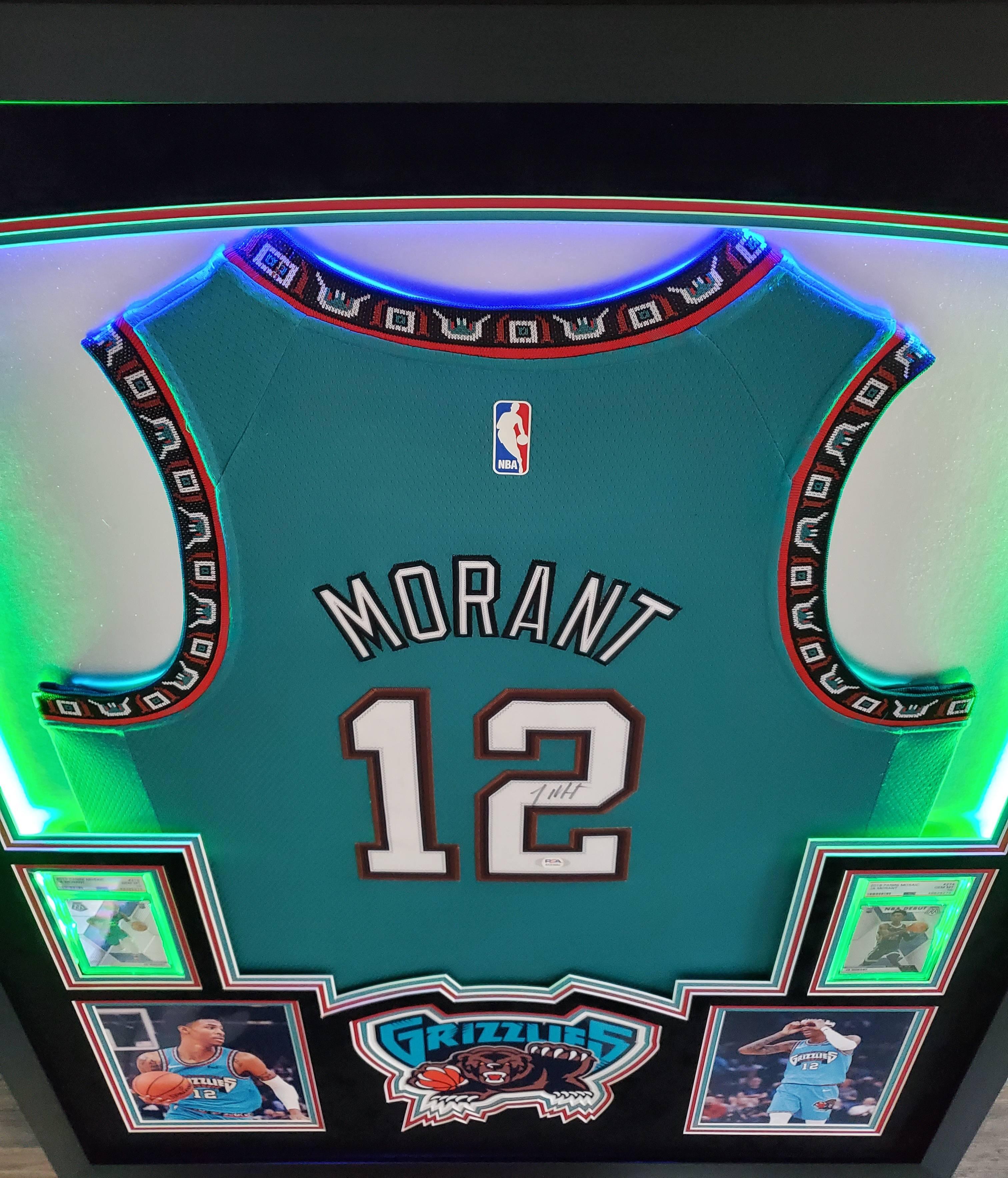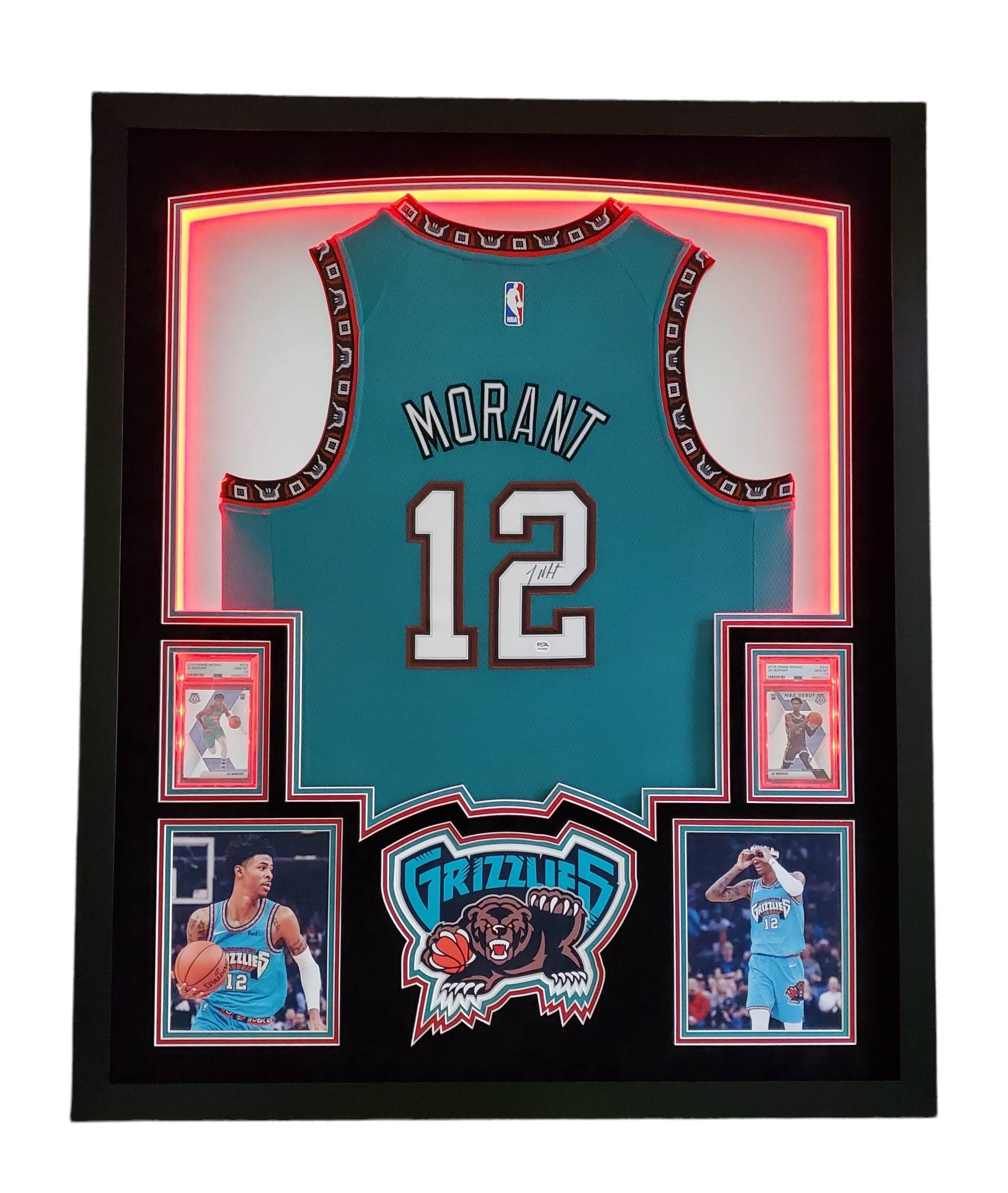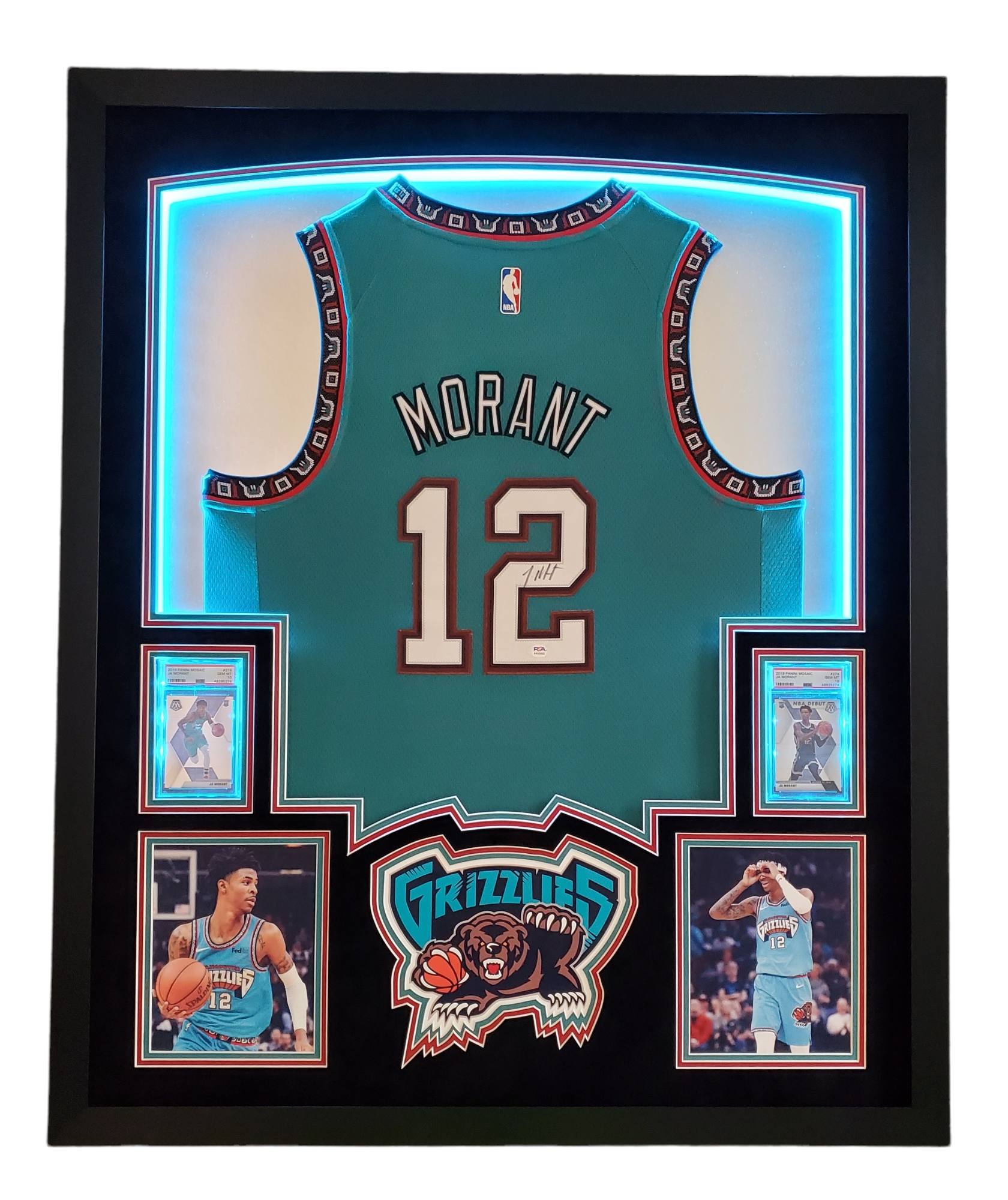 Custom frame measures 34" x 42" in size and features a on-court style jersey that has been hand-signed by Ja Morant (Memphis. Grizzlies). Display also includes (2) 8" x 10" photos. The frame includes embedded USB-powered LED lights.