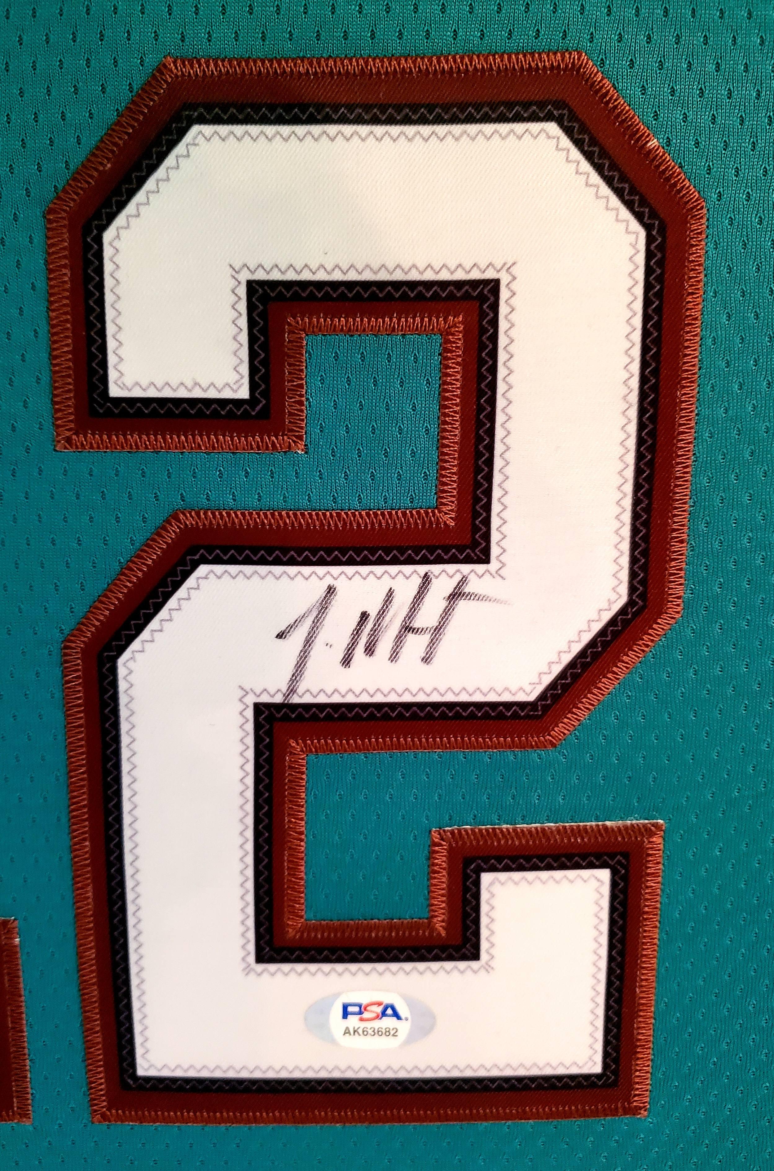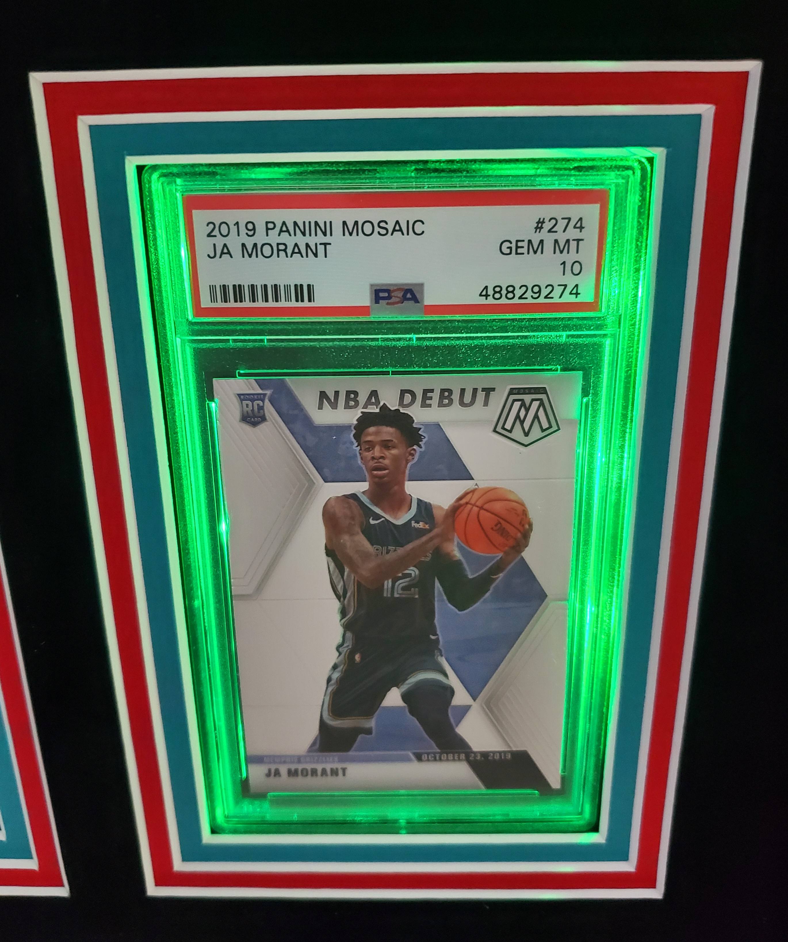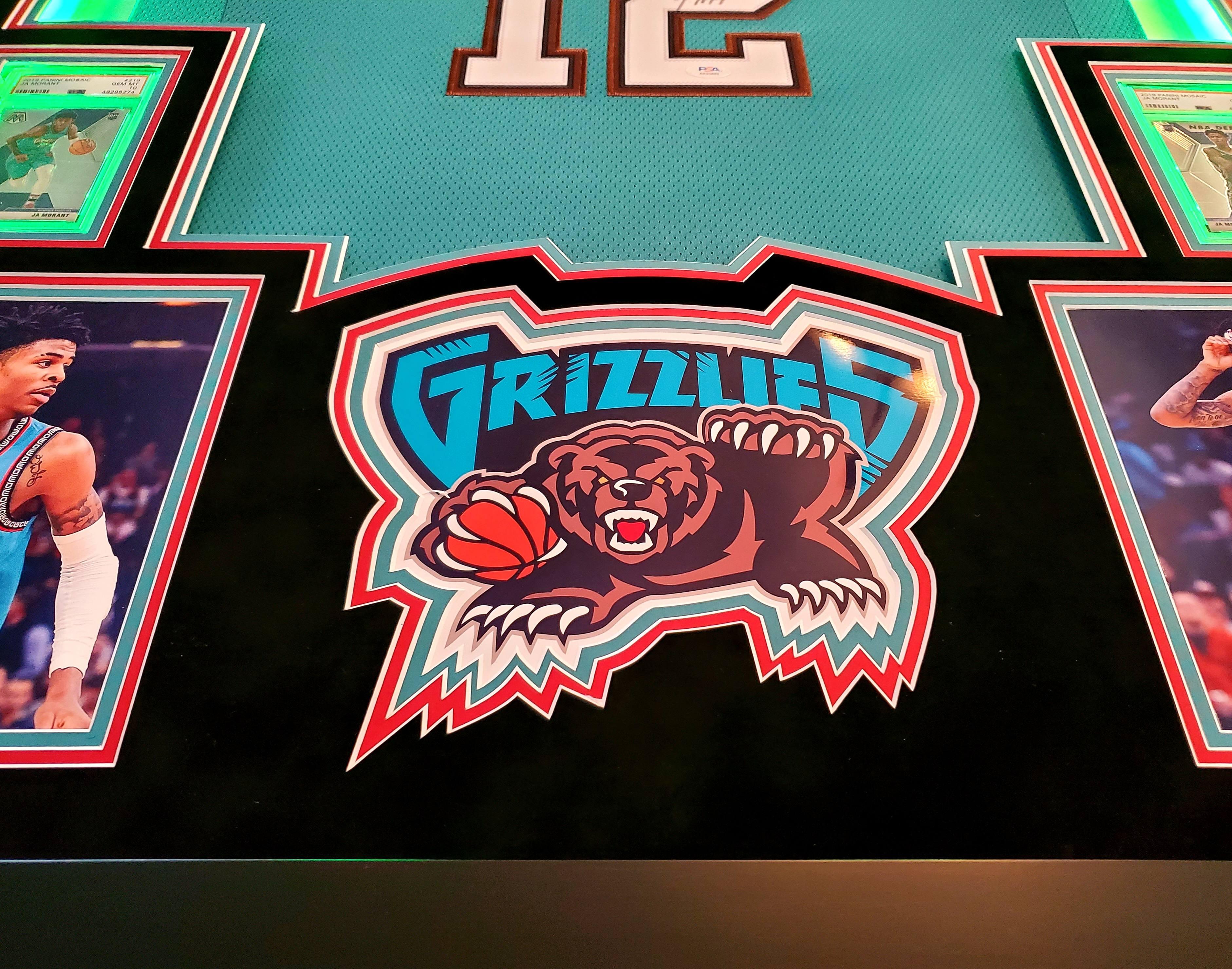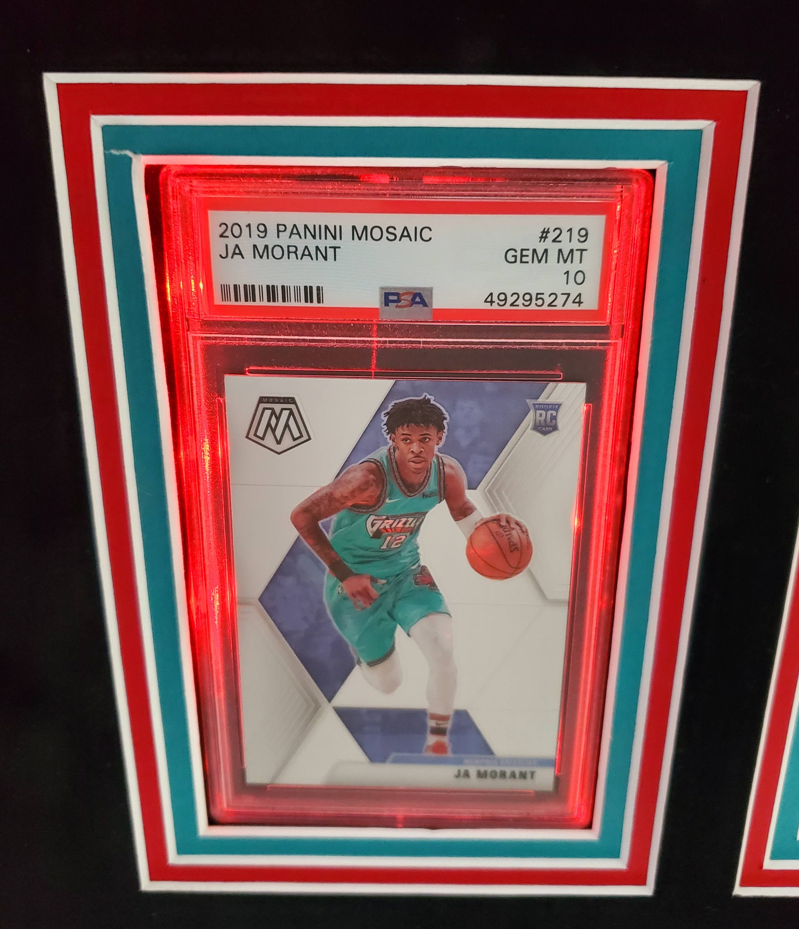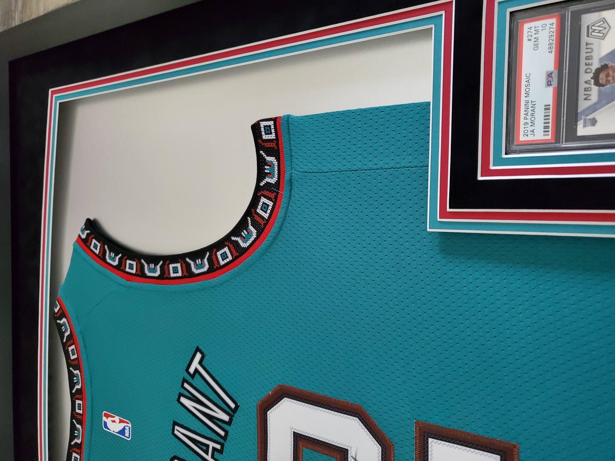 Custom frame measures 34" x 42" in size and features a on-court style jersey that has been hand-signed by Ja Morant (Memphis. Grizzlies). Display also includes (2) 8" x 10" photos. The frame includes embedded USB-powered LED lights.