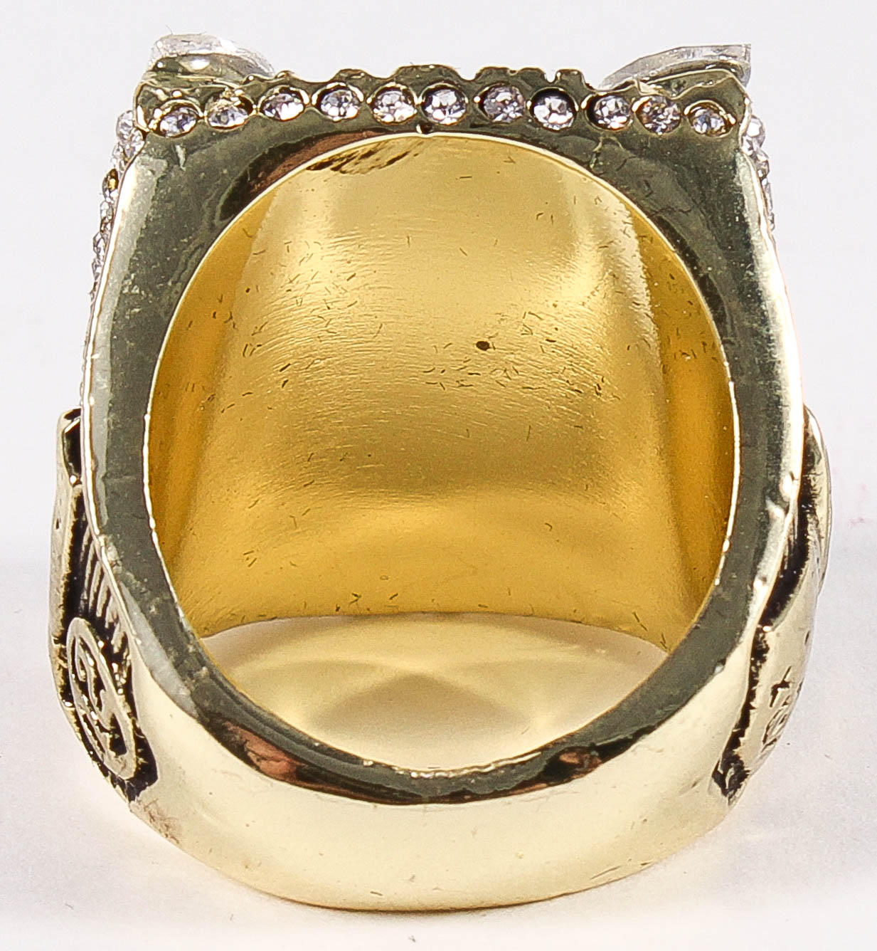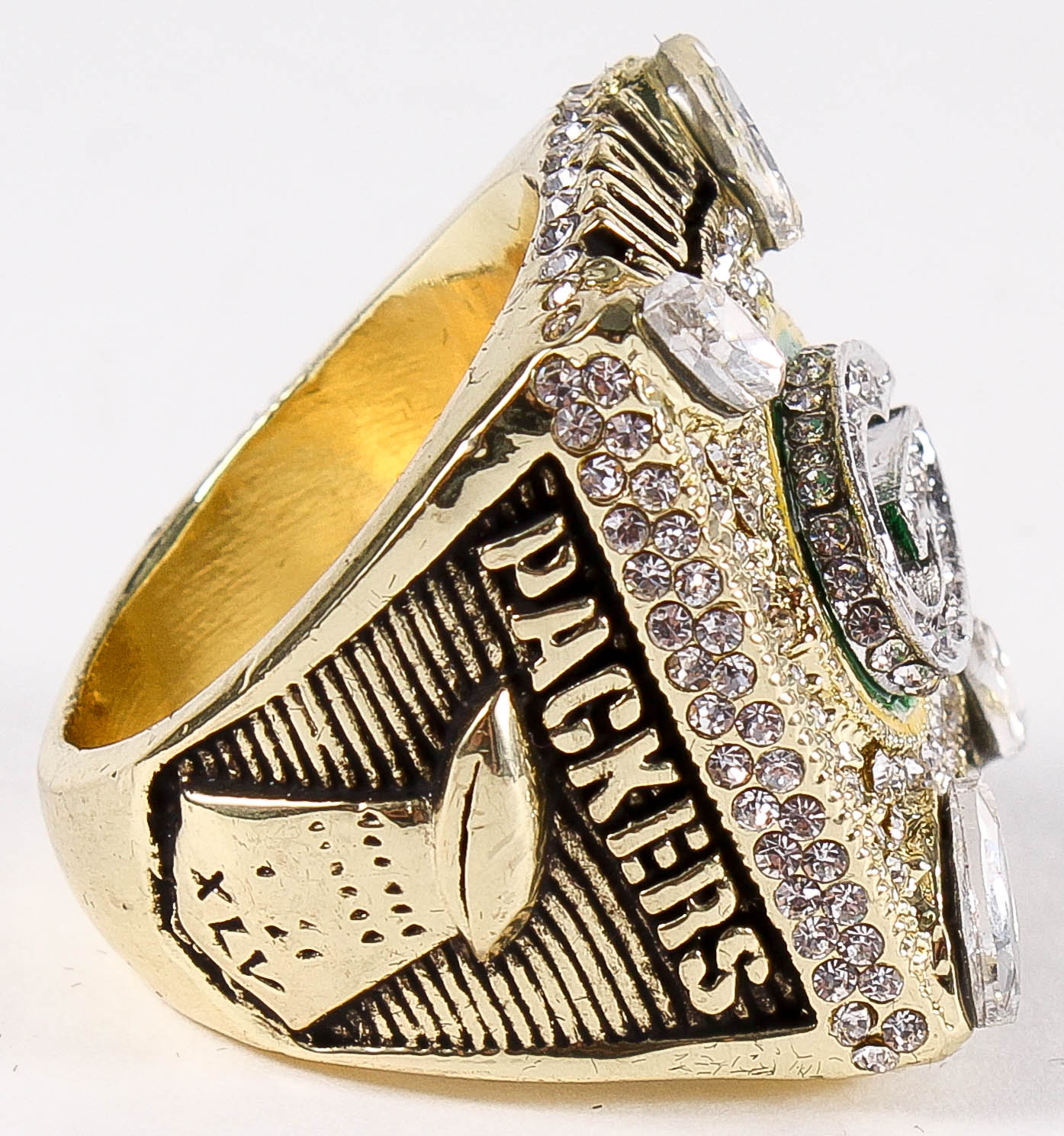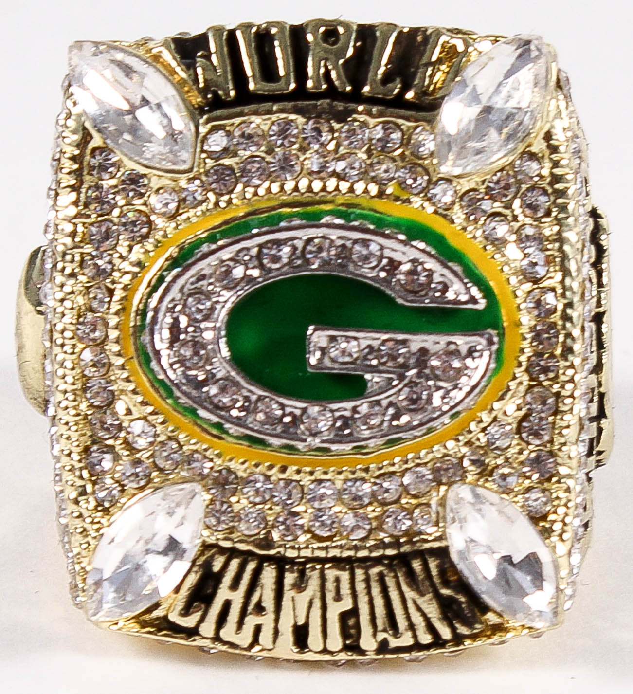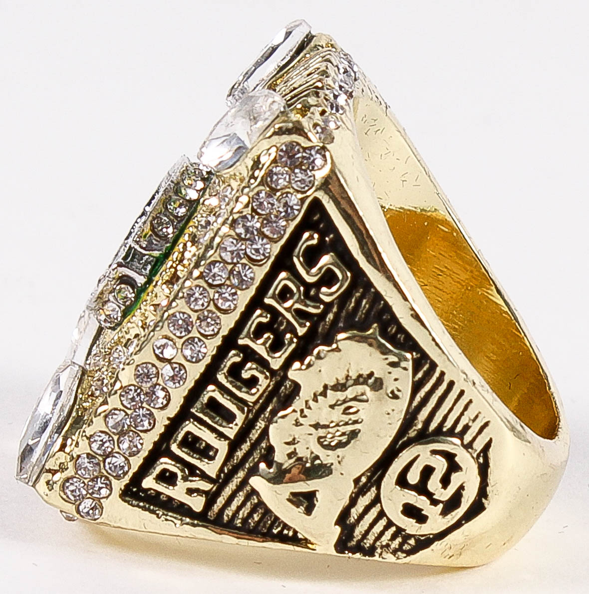 Aaron Rodgers Packers High Quality Replica 2010 Super Bowl XLV champions ring. The ring has been hand crafted by professional jewelers. Made of metal alloy and clad with gold. Size 11.