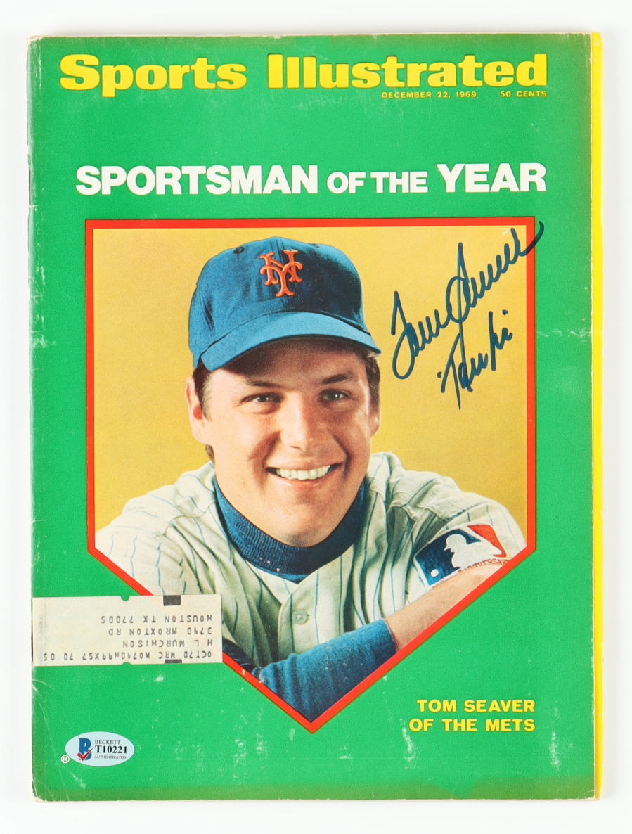 December 22, 1969 issue of Sports Illustrated magazine has been hand-signed and inscribed by Tom Seaver (New York Mets. HOF). Please note, the back left part of the magazine is torn and stained.