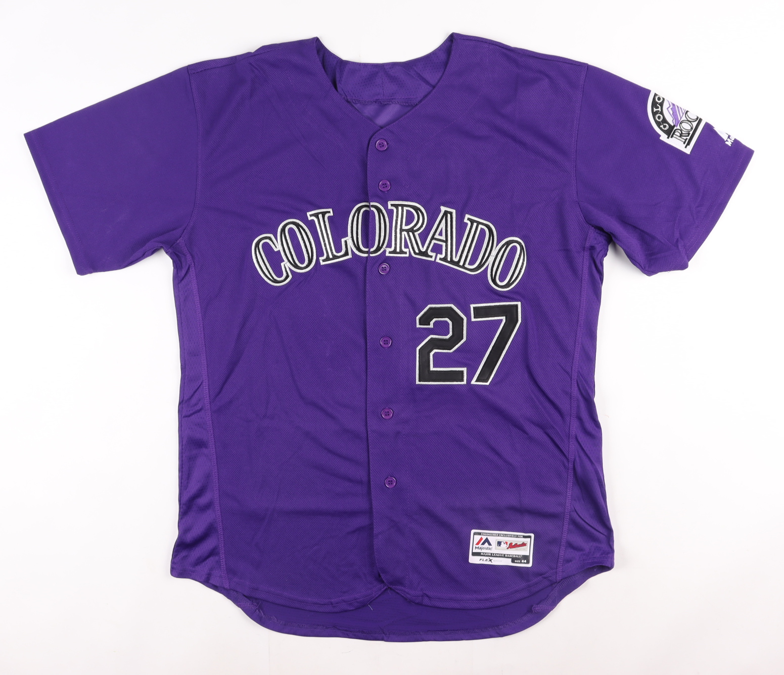 Majestic on-field style jersey. Everything sewn on, size 44. Hand-signed and inscribed by Trevor Story (Colorado Rockies).