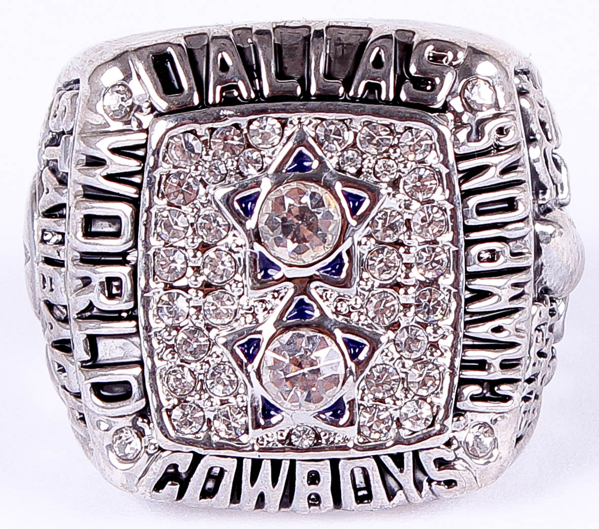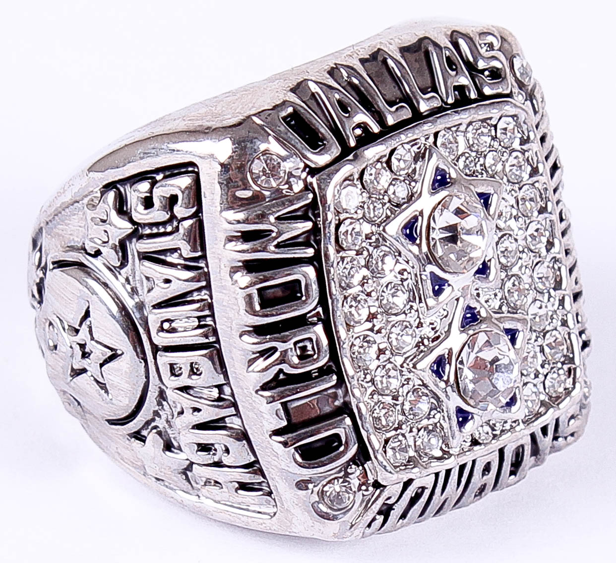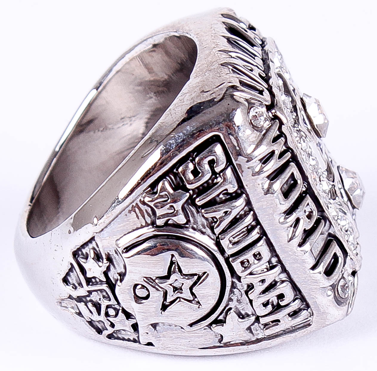 Roger Staubach Dallas Cowboys 1977 High Quality Replica Super Bowl Championship Ring. The ring has been hand crafted by professional jewelers. Made of metal alloy and clad with silver. Size 10.5.