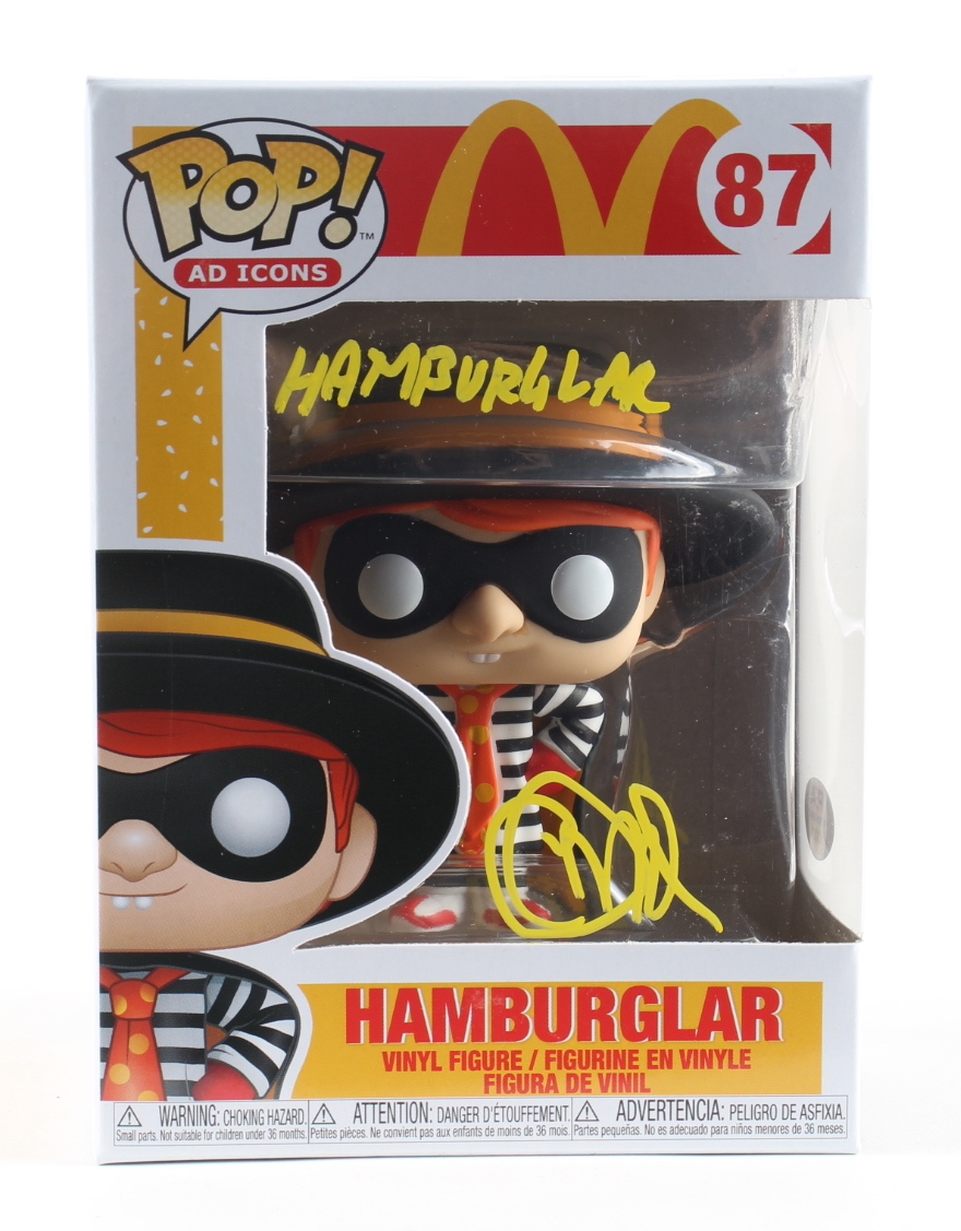 Funko Pop! figure measures approximately 4" tall and has been hand-signed and inscribed on the packaging by Charlie Adler (Hamburglar).