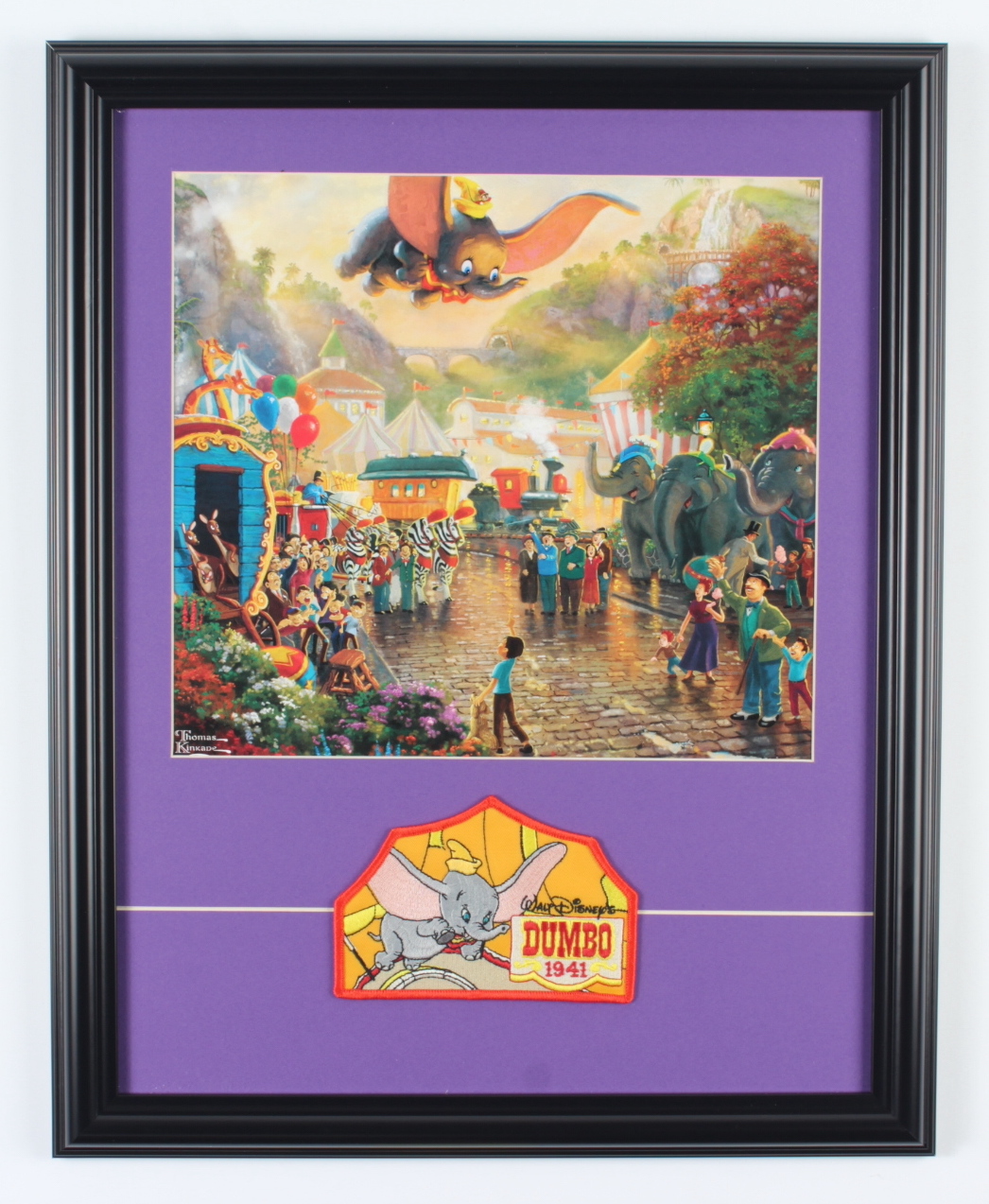 Custom framed print measures approximately 16" x 20" in size. Display features a print from Thomas Kinkade (D. 2012) and a "Dumbo" cloth movie patch.