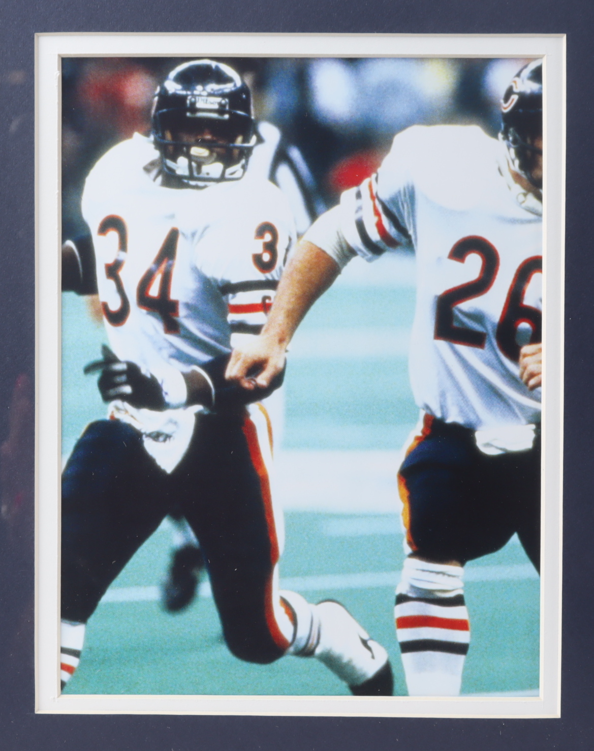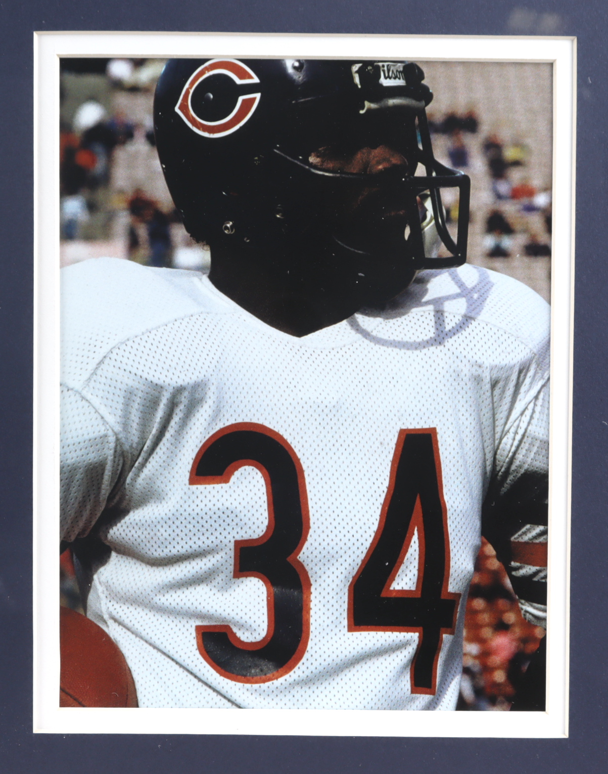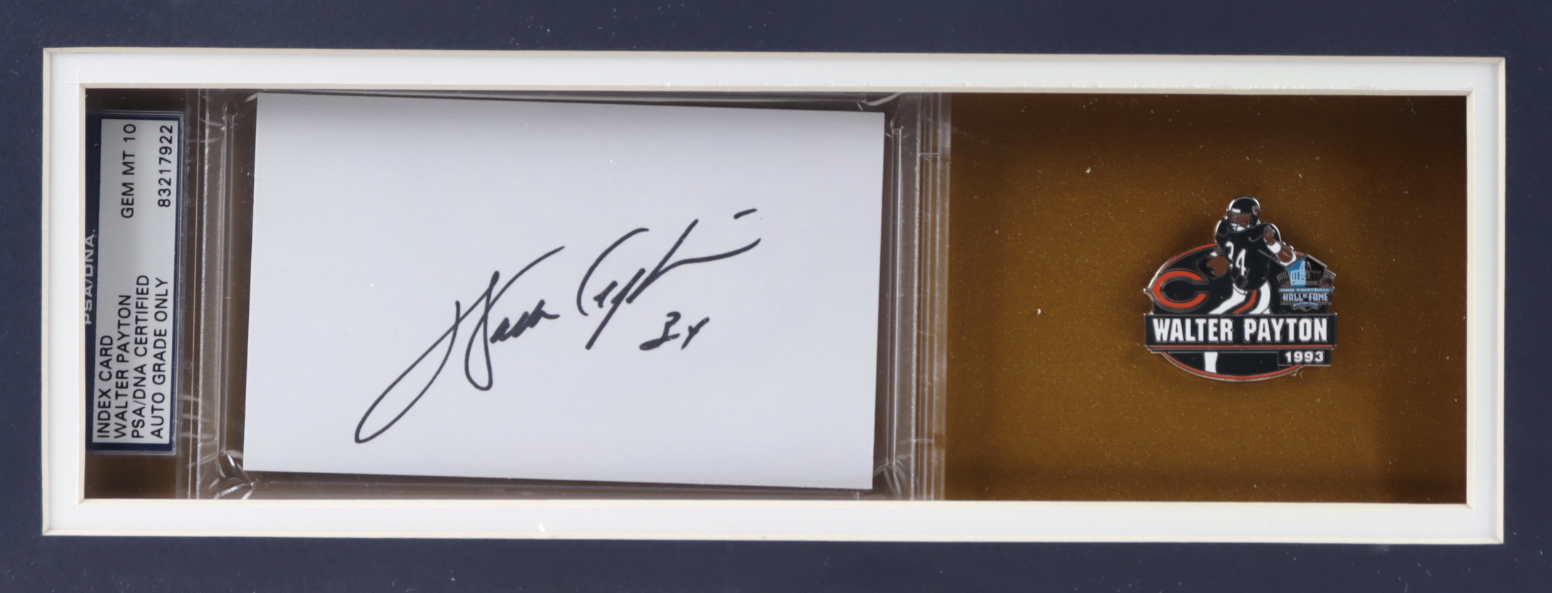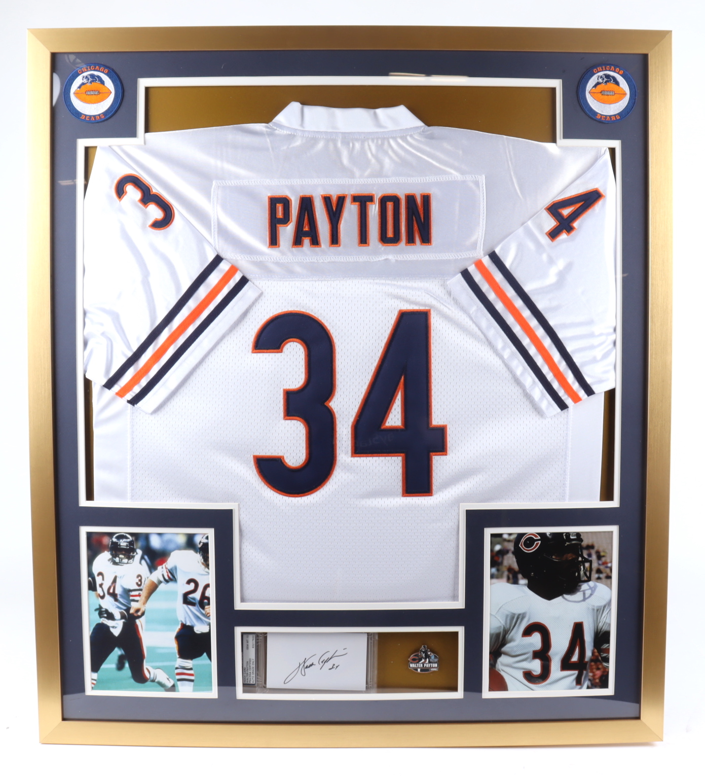 Custom framed display measures approximately 32" x 36" in size. Display features an index card that has been hand-signed by Walter Payton (D. 1999, Chicago Bears, HOF). Includes an original football Hall of Fame pin, two 8x10 photos, and a custom jersey.