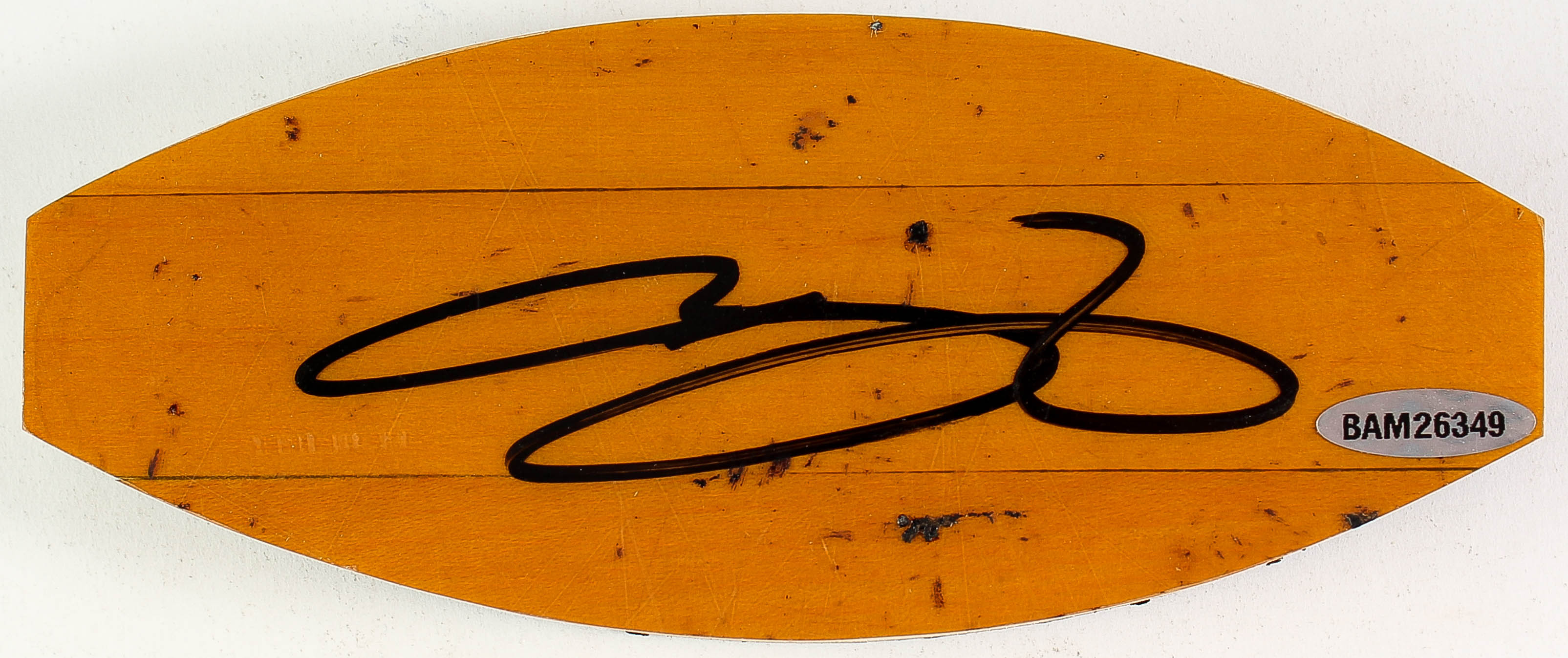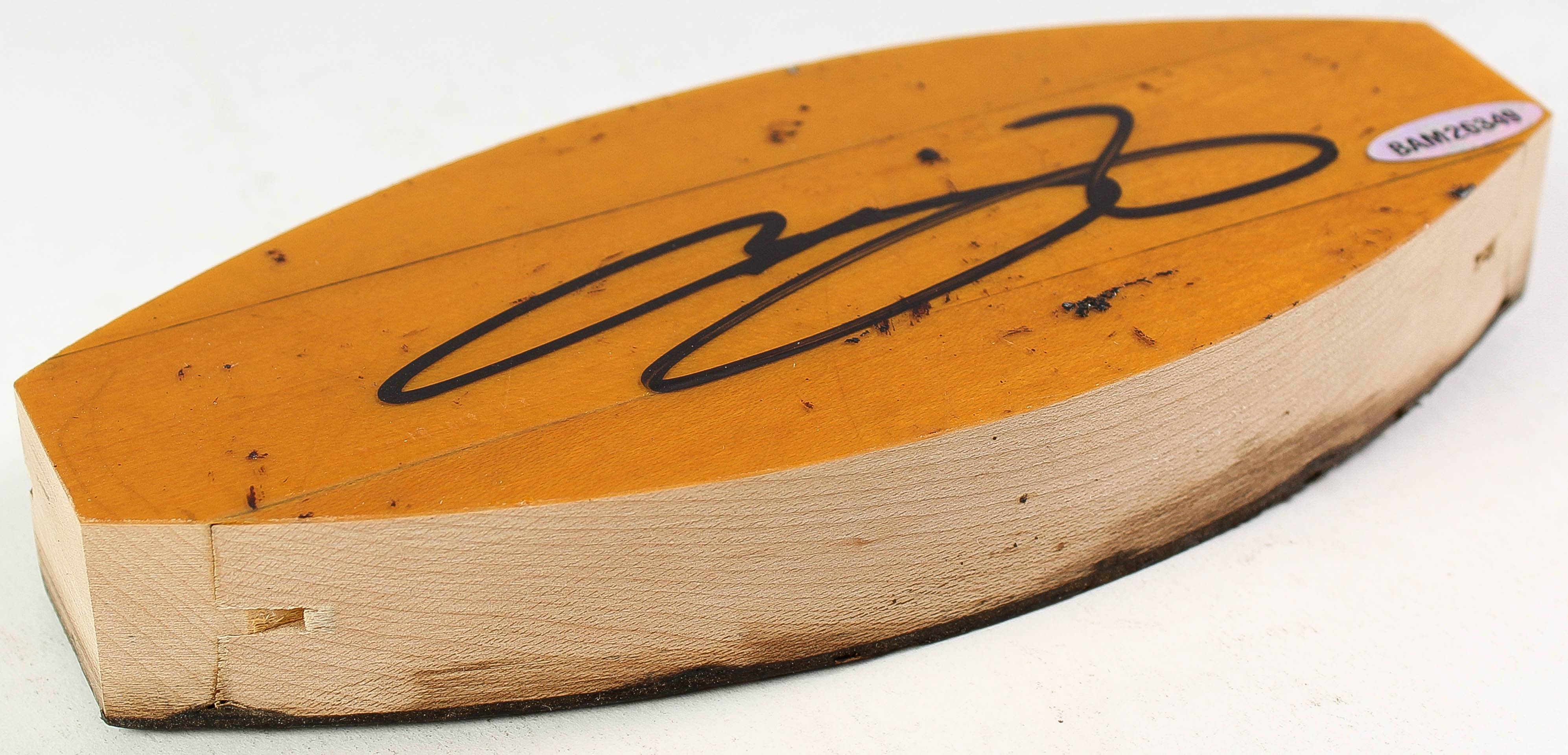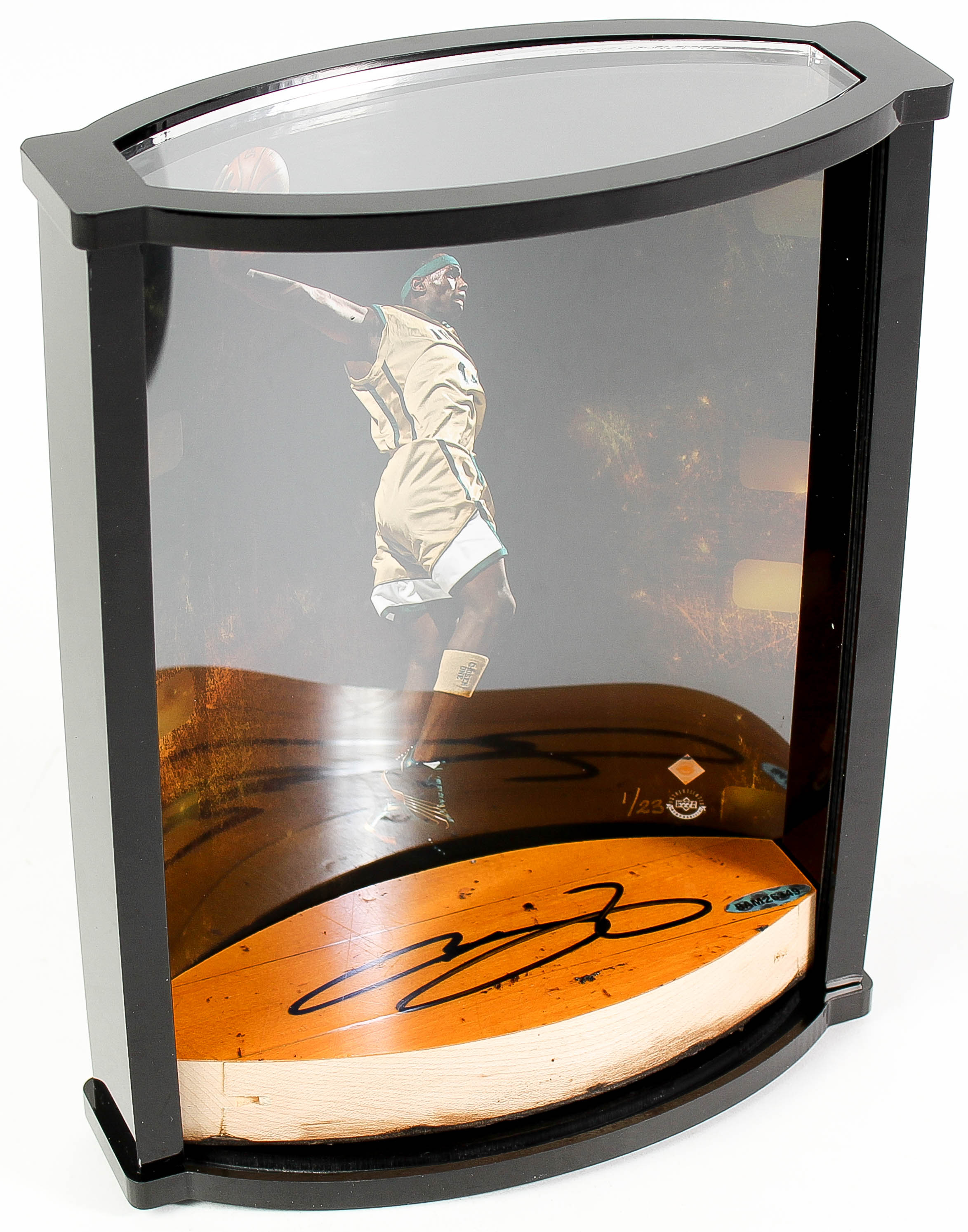 Game-Used Floor Piece from St. Vincent - St. Mary High School has been hand-signed in black felt-tip pen by LeBron James (Cavaliers). Floor piece comes in a custom curve display case. Display is limited edition and hand-numbered #1/23.