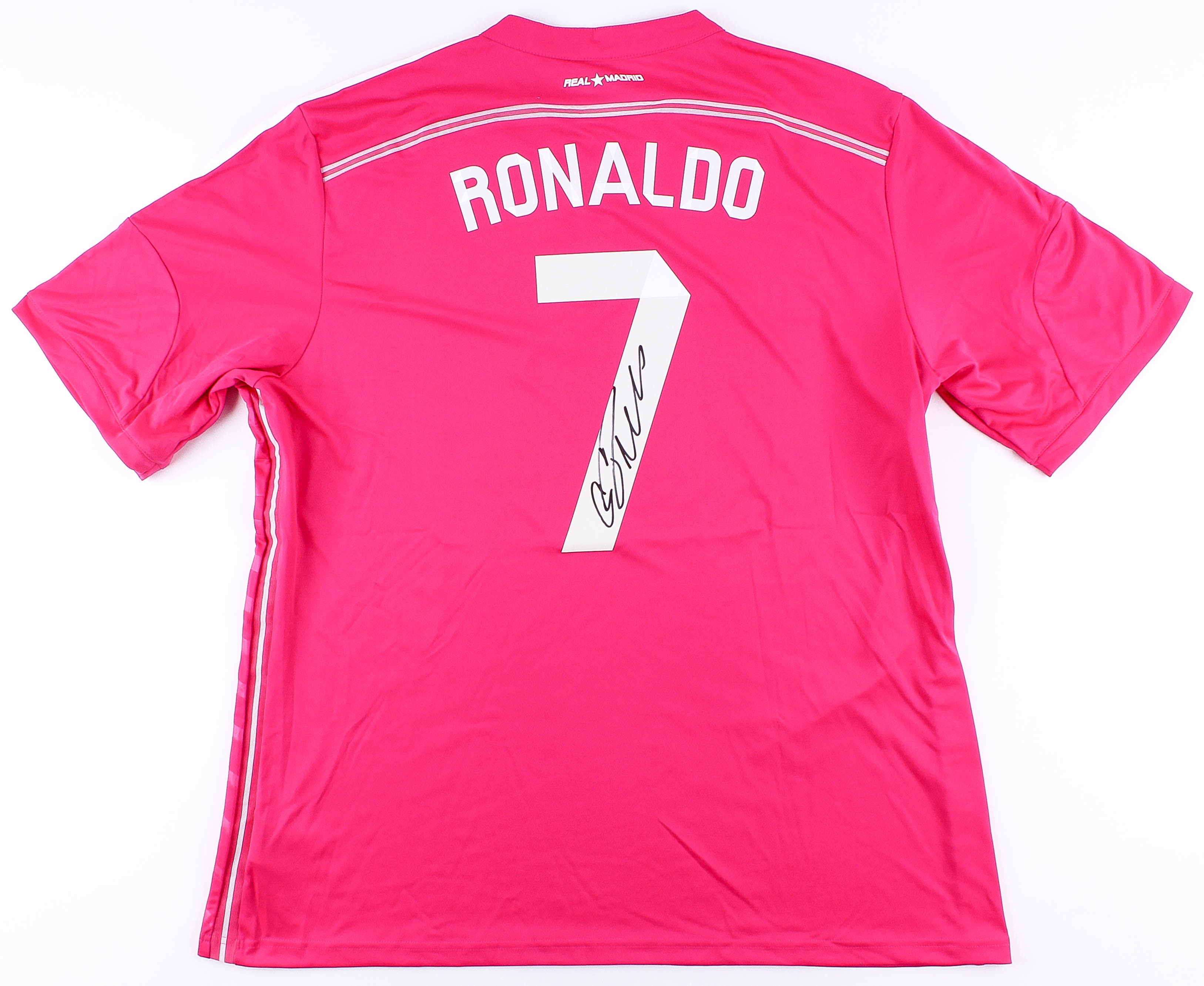 Adidas on-field style jersey. Everything is printed on, size XL . Hand-signed in black felt-tip pen by Cristiano Ronaldo.