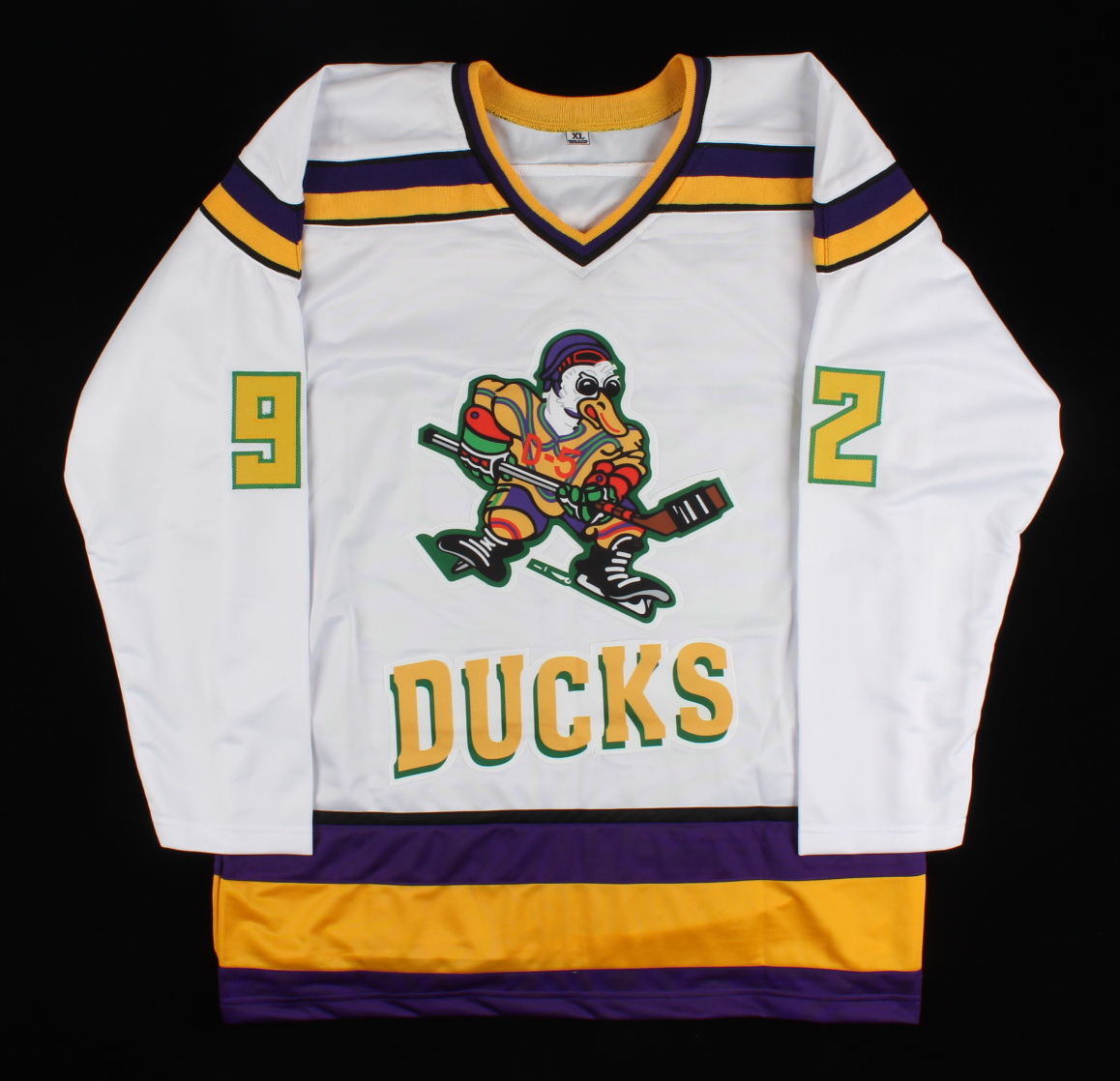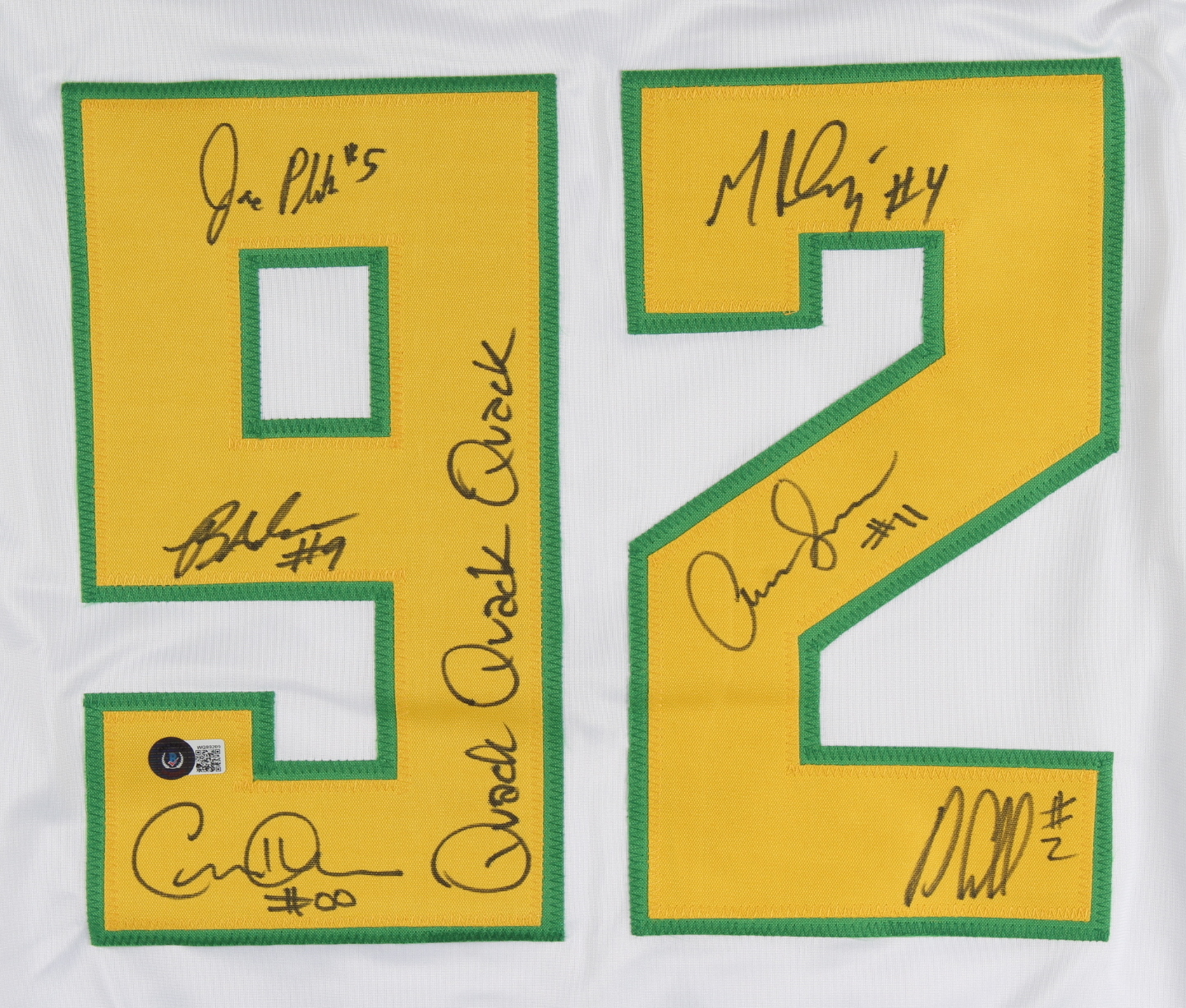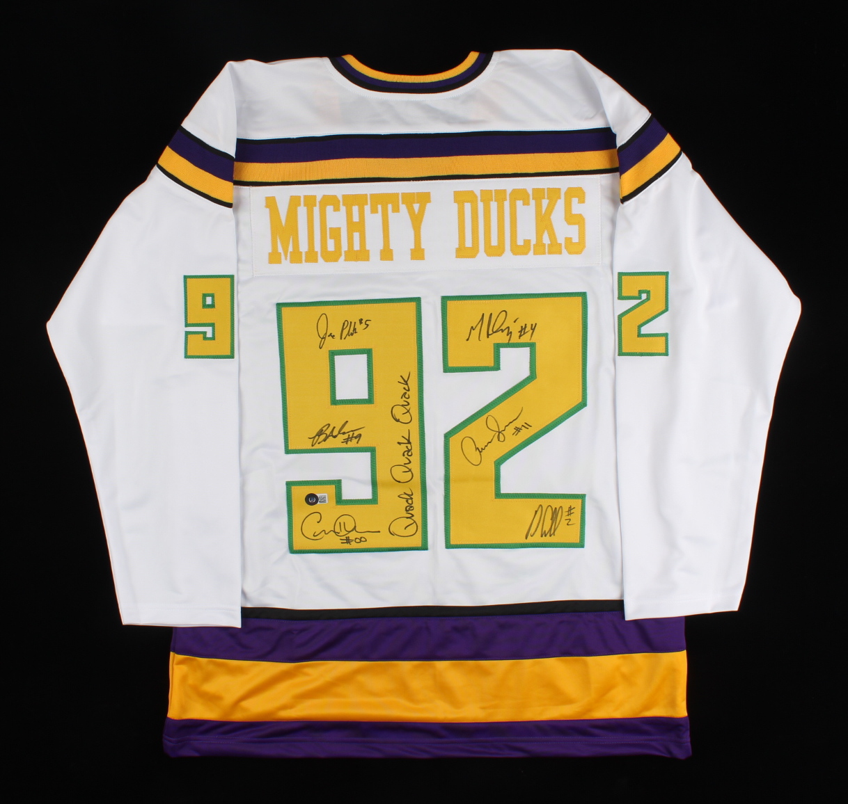 "The Mighty Ducks" Jersey Cast-Signed by (6) with Brandon Adams, Jane Plank, Matt Doherty, Garette Henson Inscribed "Quack Quack Quack" (Beckett)
