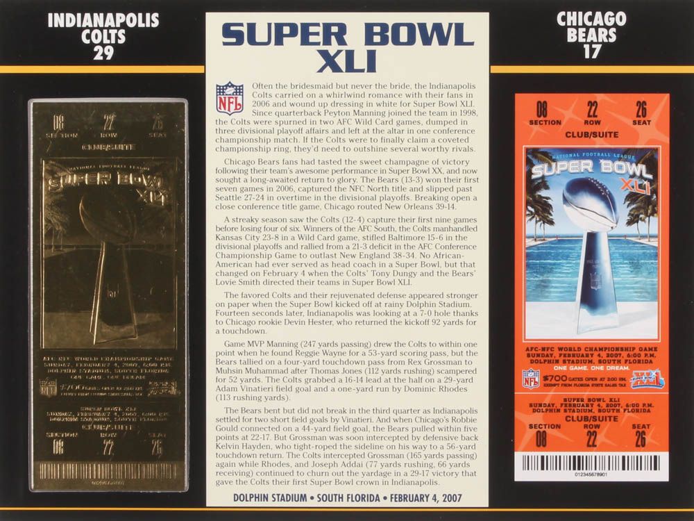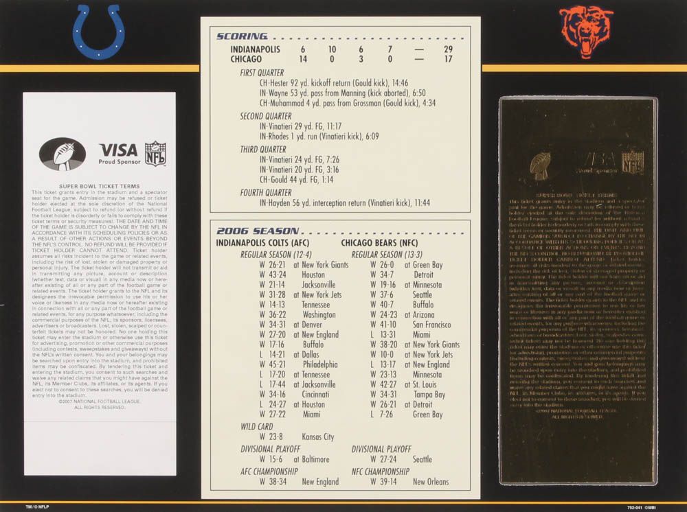 2007 Commemorative Super Bowl XLI Card with Ticket: Colts vs Bears