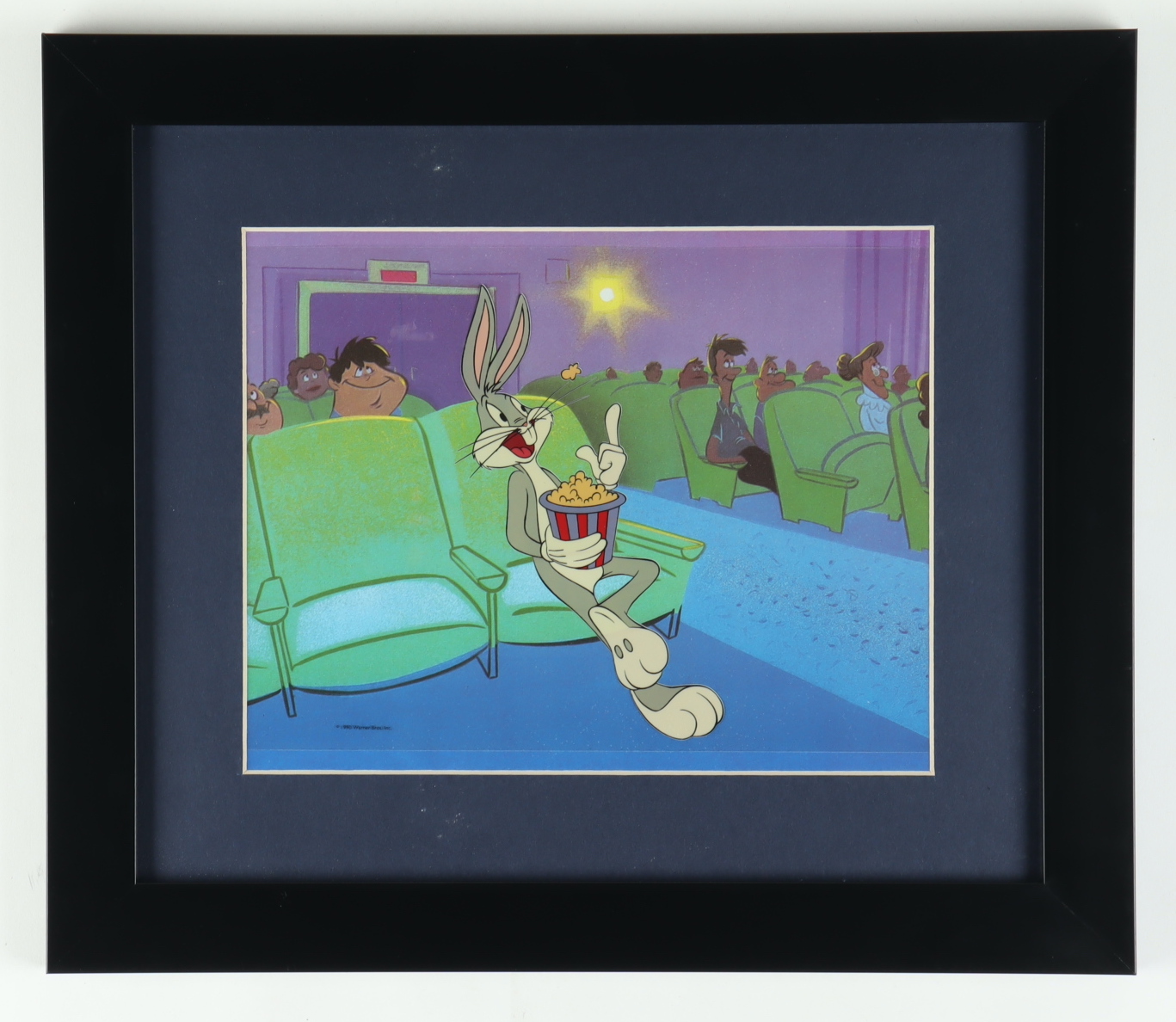 Custom framed display measures approxiamtely 16" x 16" in size and features a sericel of Warner Brother's "Bug's Bunny at the Movies". Please note, top and bottom of the sericel is stained.
