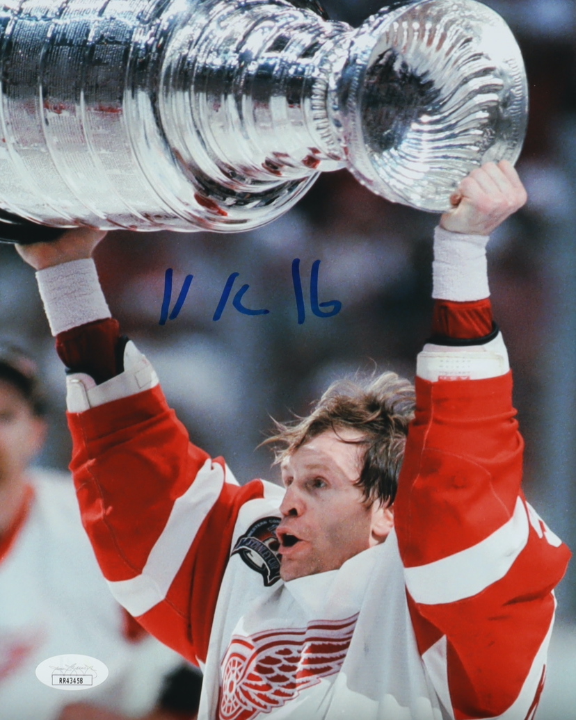 Photo measures 8" x 10" in size and has been hand-signed by Vladimir Konstantinov (Detroit Red Wings).