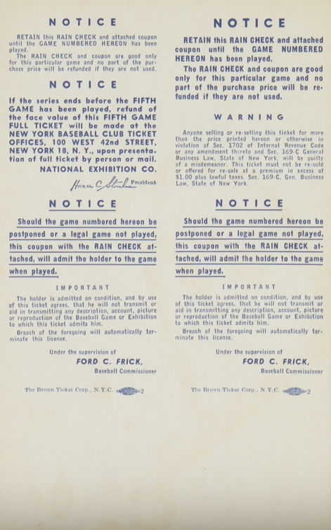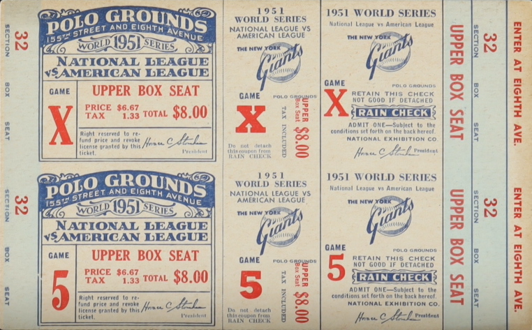 Uncut Sheet of (2) 1951 World Series Game 5 Tickets